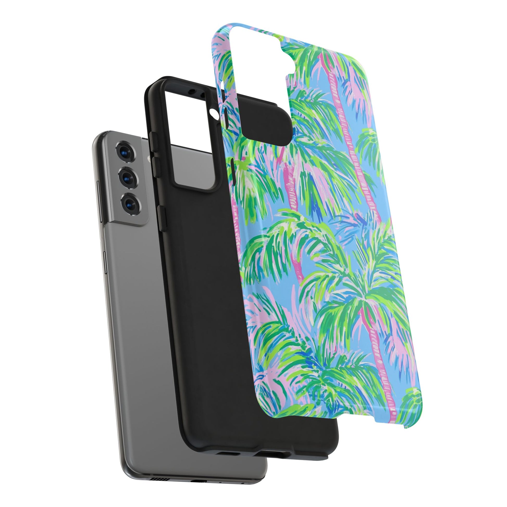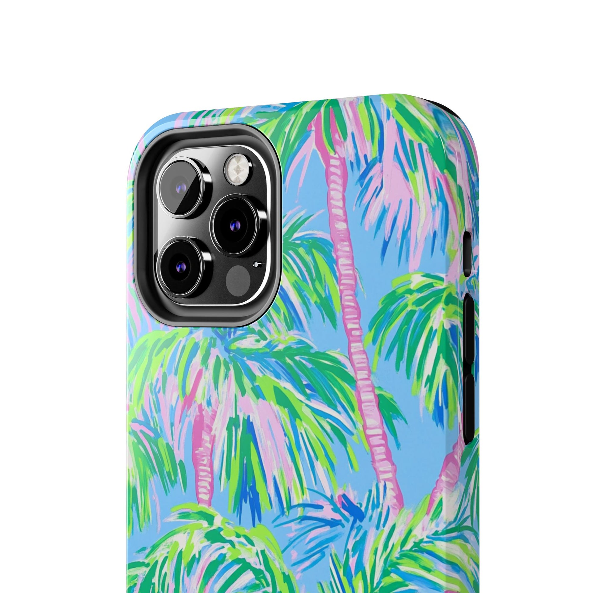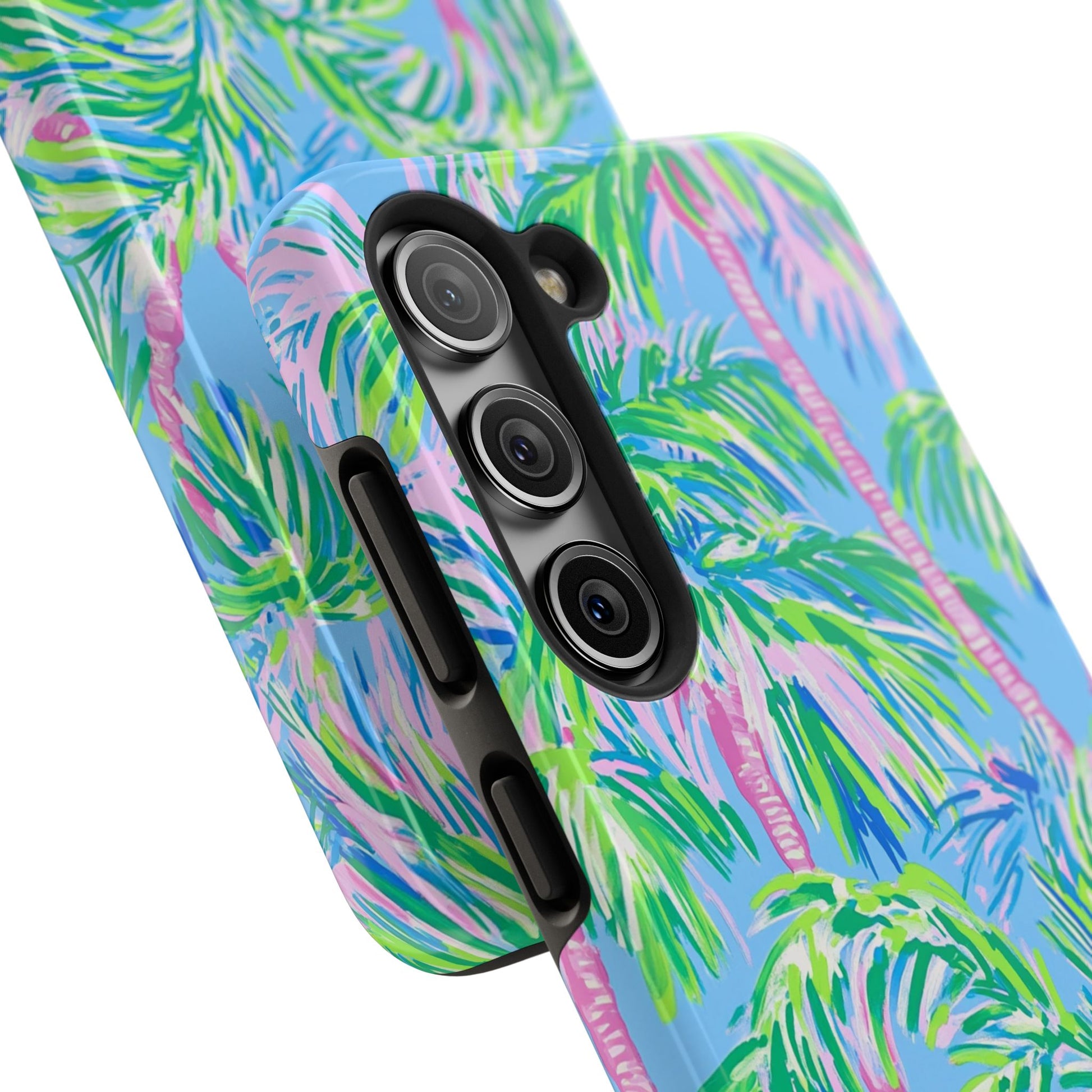 Vibrant and colorful phone cases featuring a design of painted palm trees. Gives off a tropical and beachy vibe, perfect for summer or vacation lovers. Great for those who want to protect their phone in style.