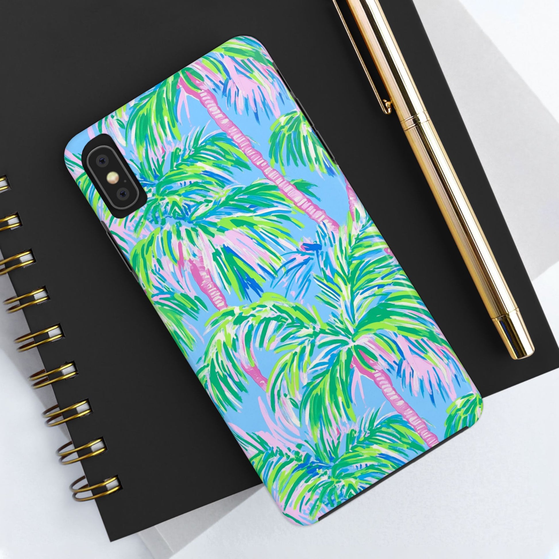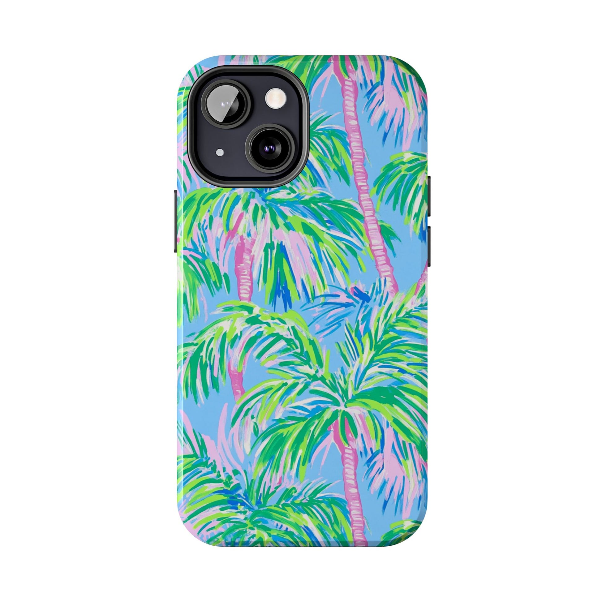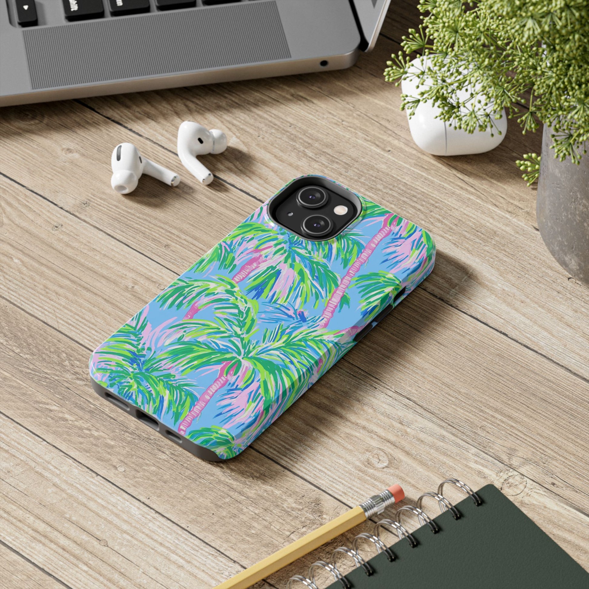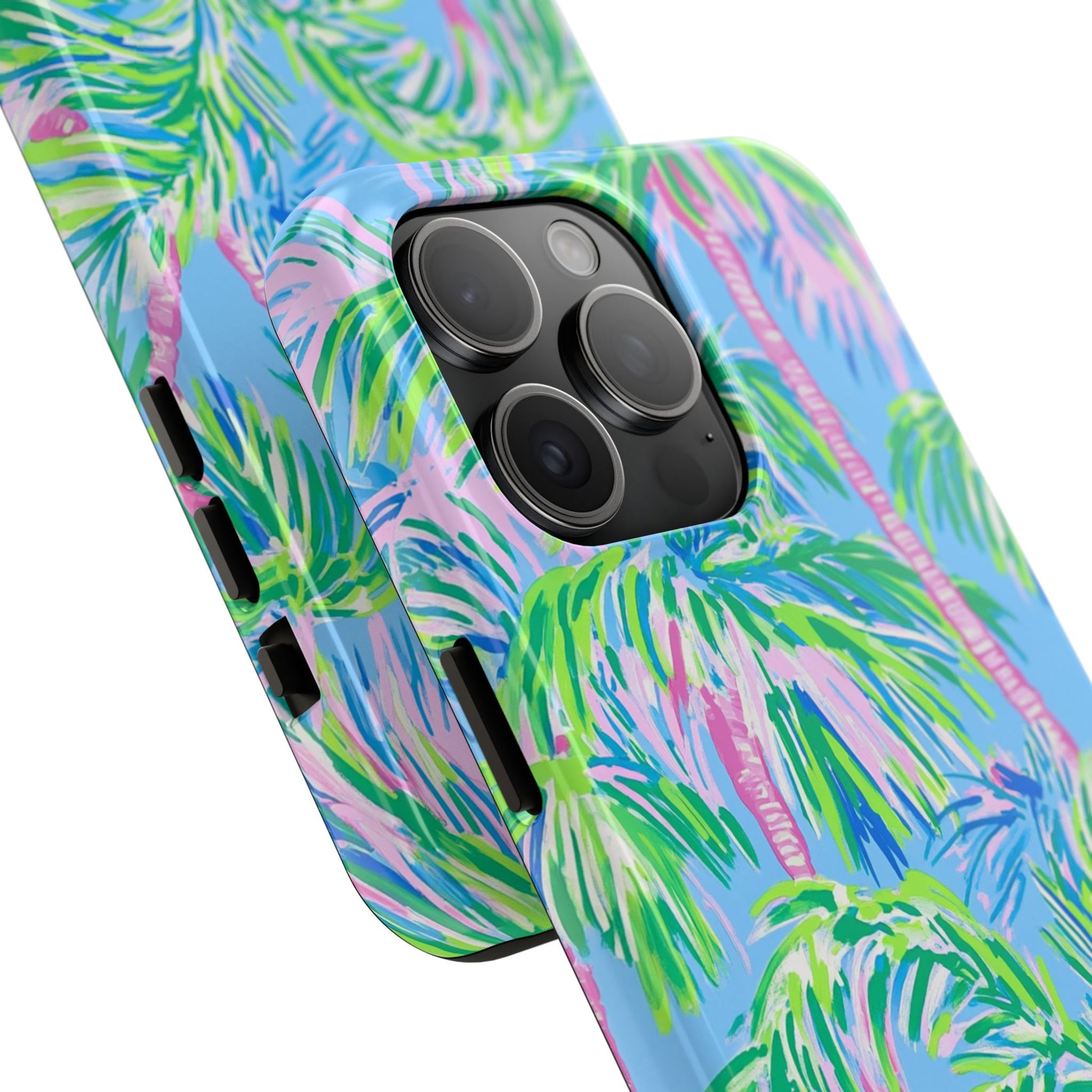 Vibrant and colorful phone cases featuring a design of painted palm trees. Gives off a tropical and beachy vibe, perfect for summer or vacation lovers. Great for those who want to protect their phone in style.