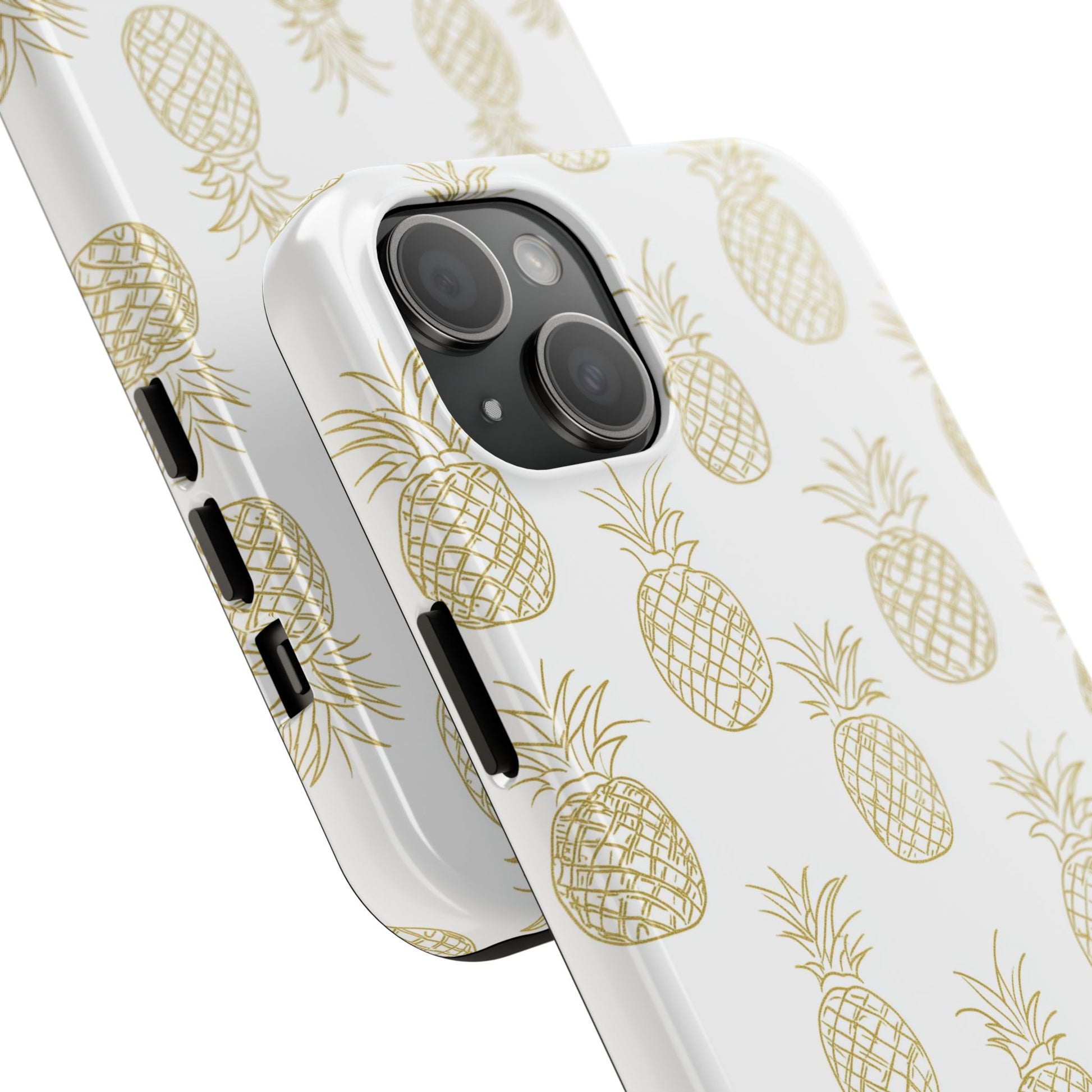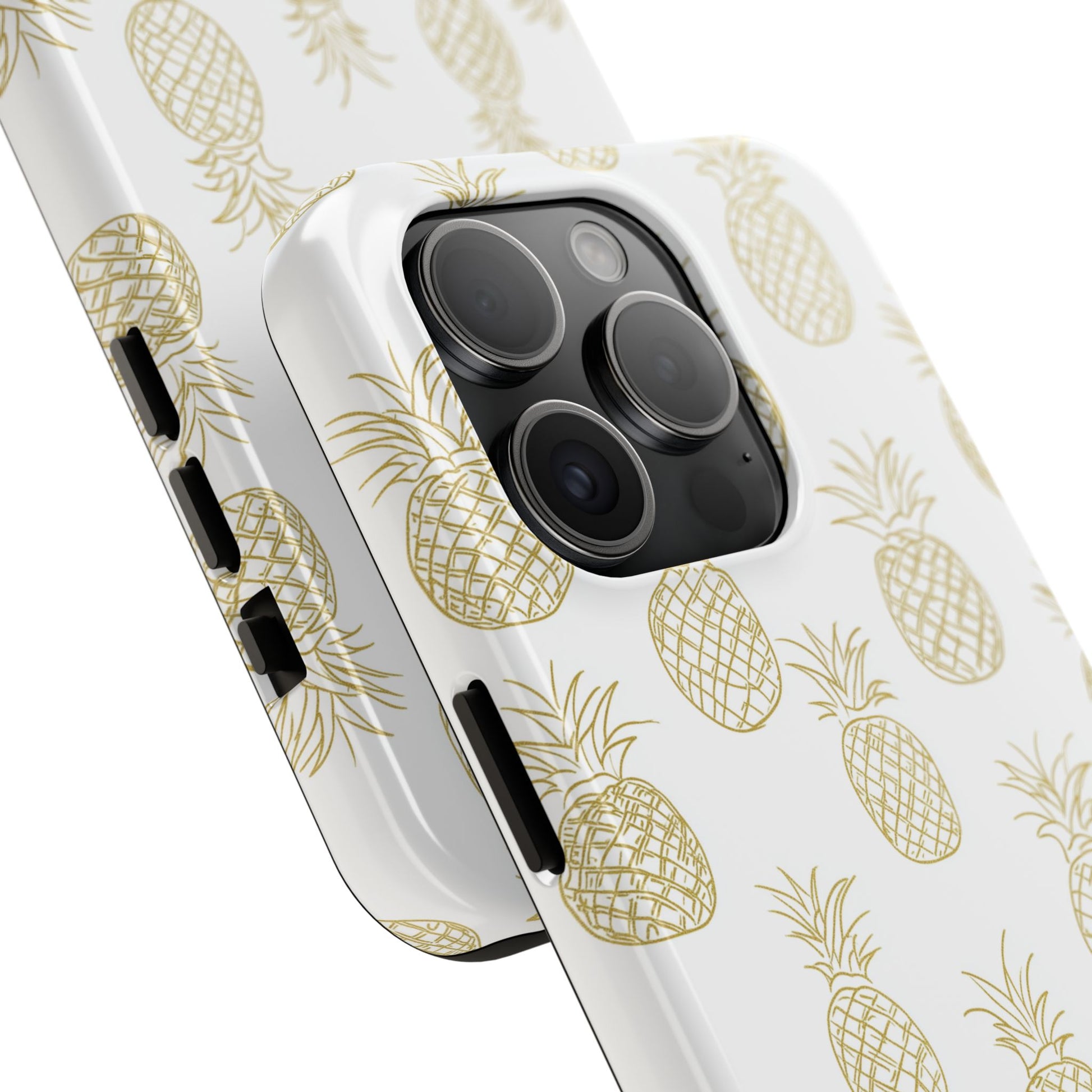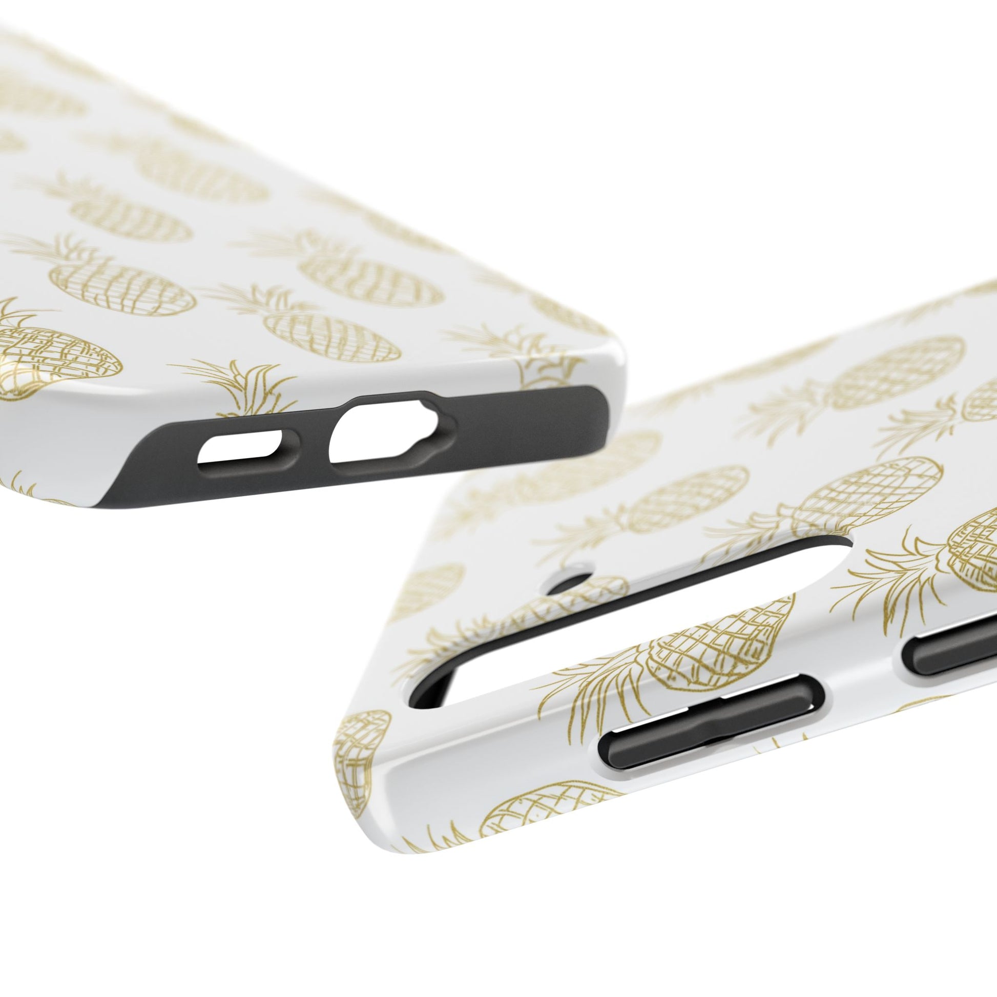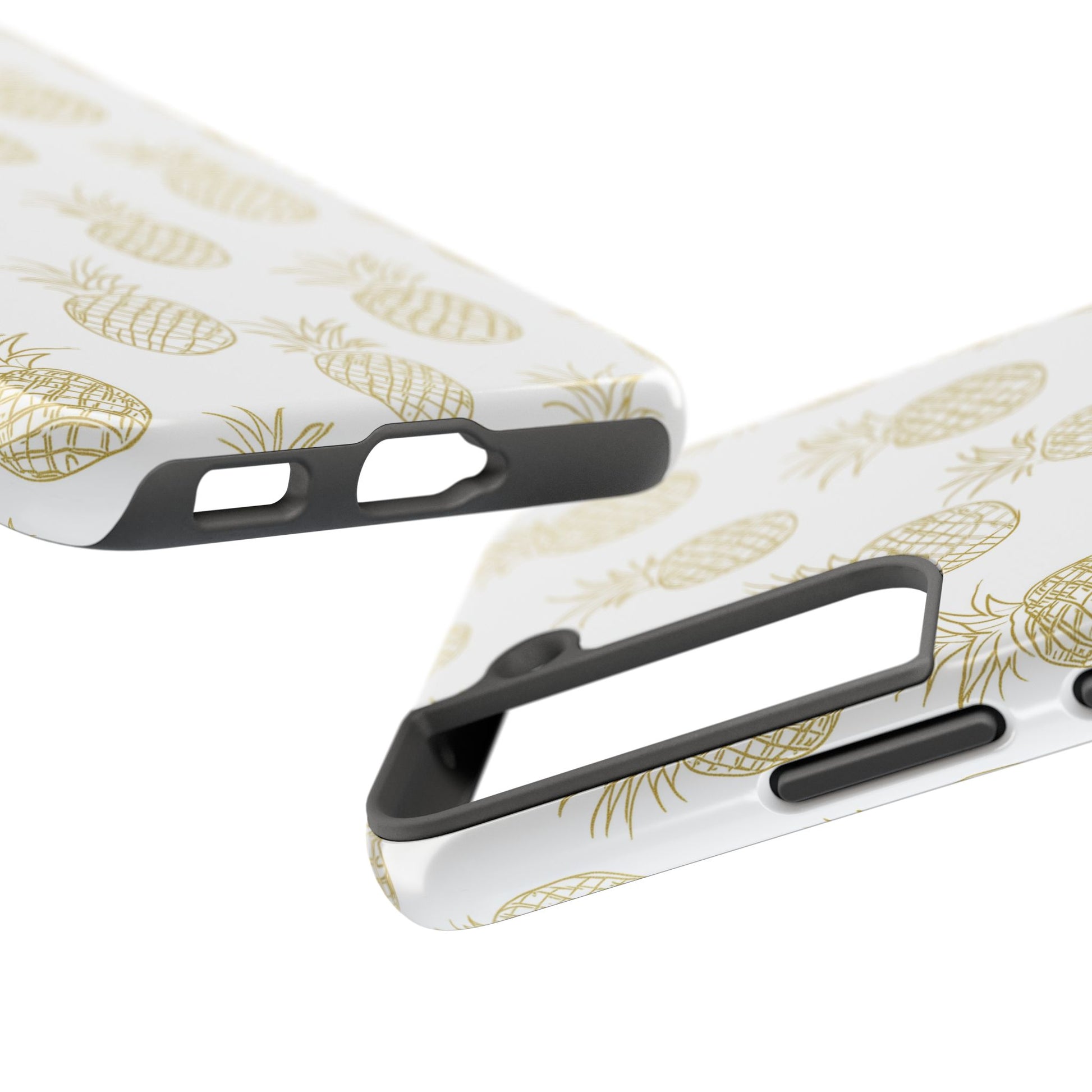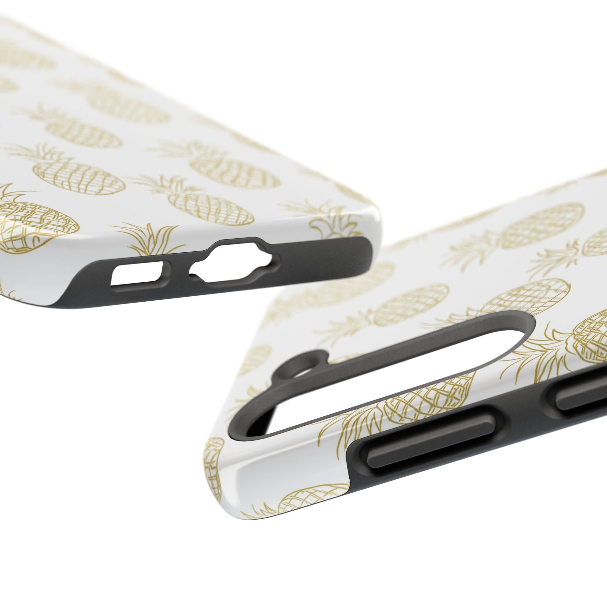 A stylish and elegant phone case featuring a golden pineapple print. This tough phone case is designed to protect your phone from impacts and scratches while adding a touch of tropical flair. Perfect for those who love fruity designs and want to keep their phone safe in style. Ideal for summer, beach holidays, and everyday use.