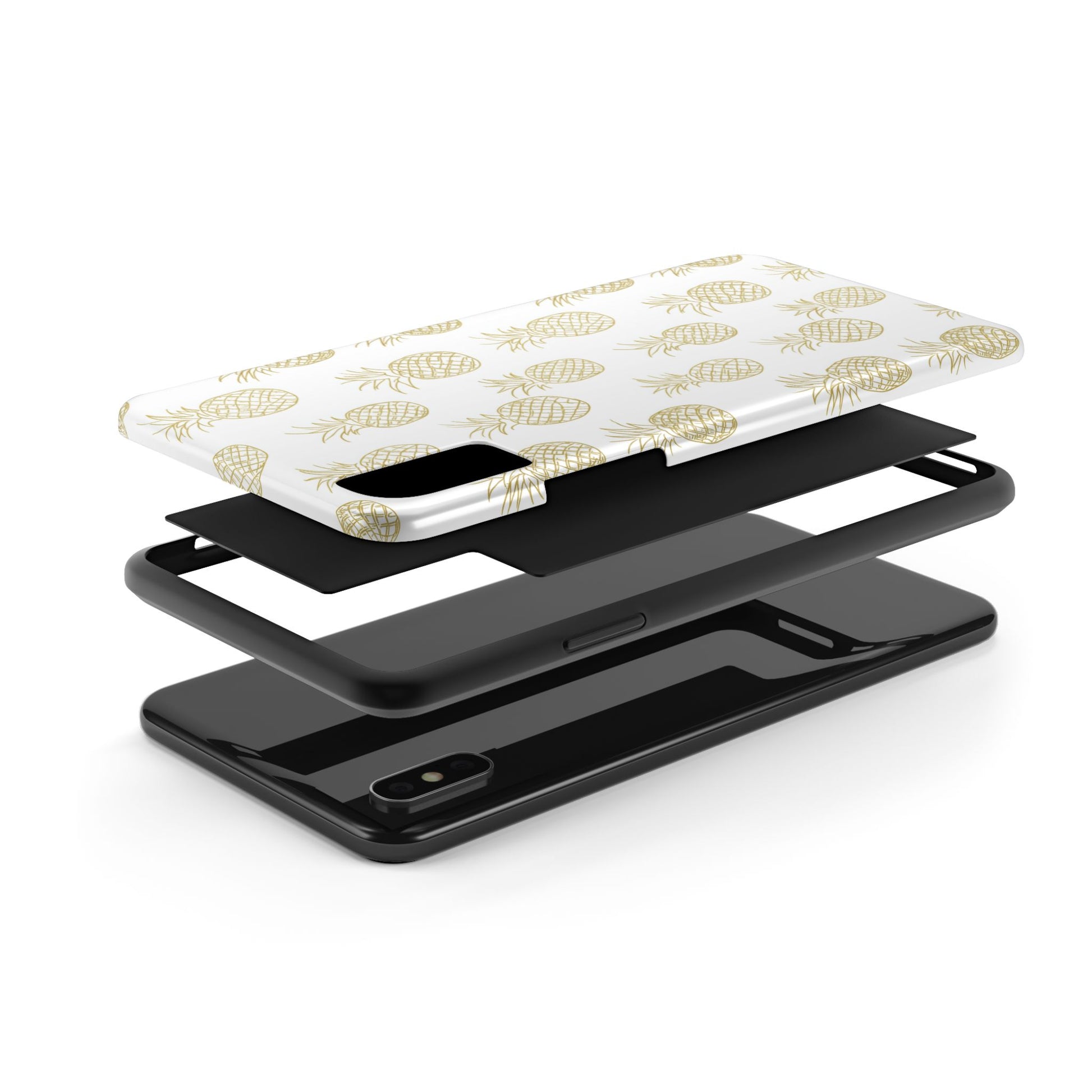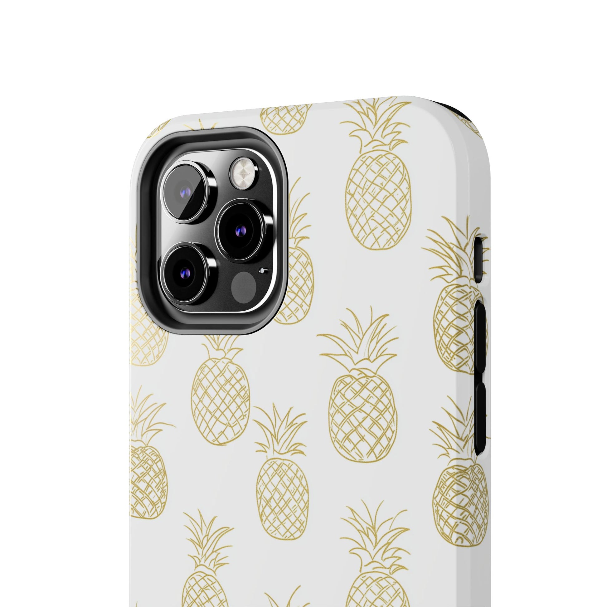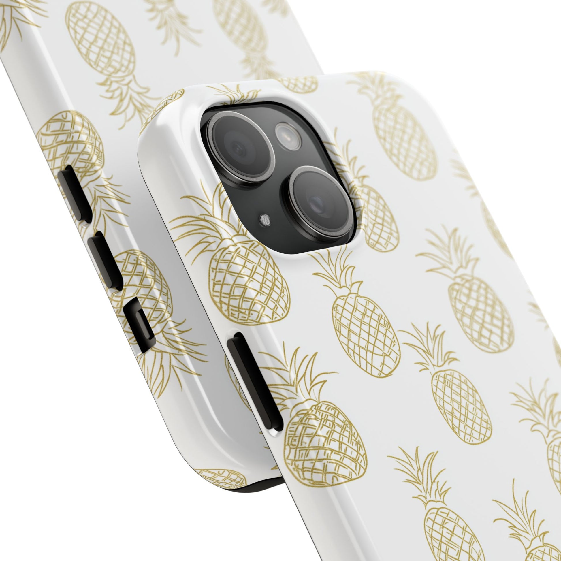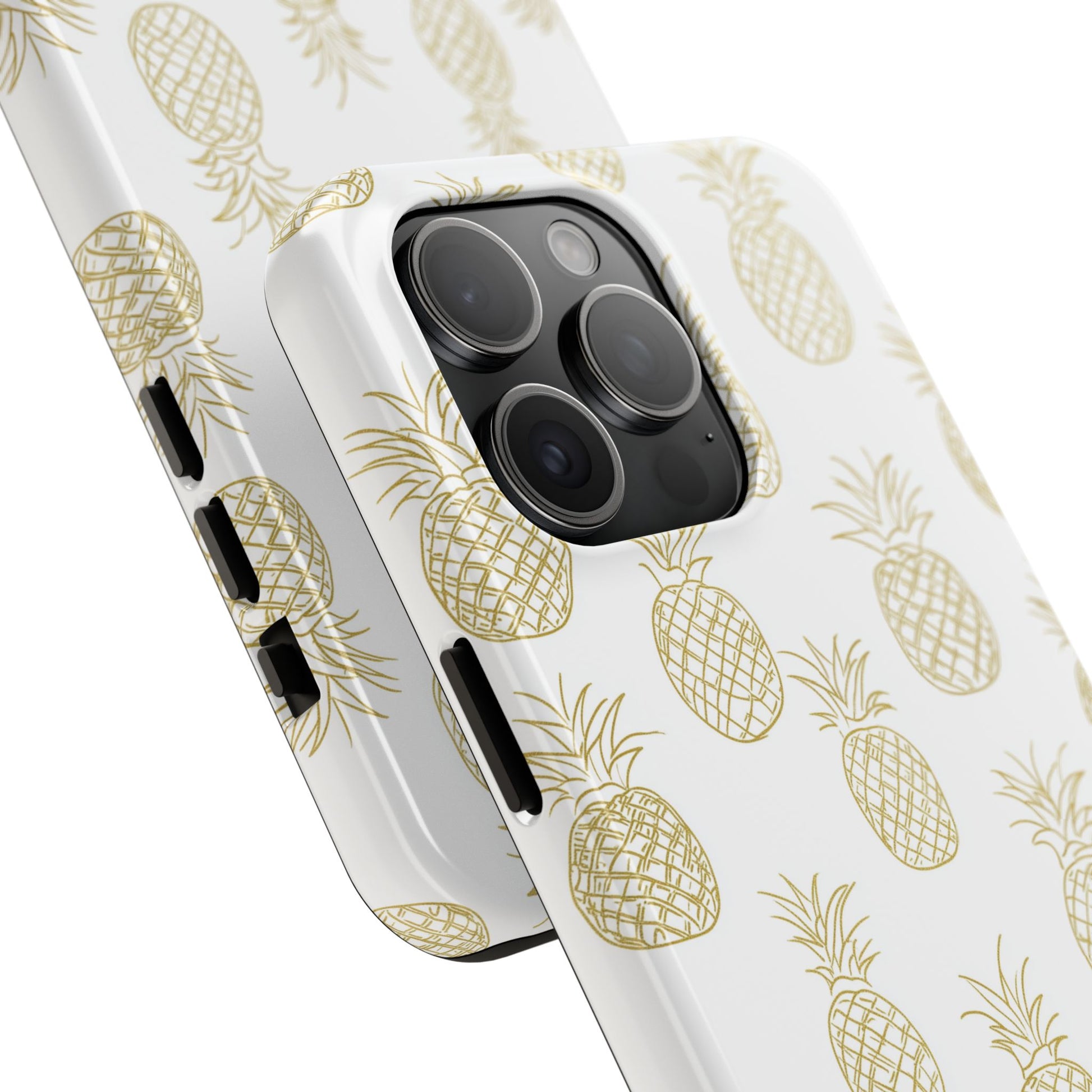 A stylish and elegant phone case featuring a golden pineapple print. This tough phone case is designed to protect your phone from impacts and scratches while adding a touch of tropical flair. Perfect for those who love fruity designs and want to keep their phone safe in style. Ideal for summer, beach holidays, and everyday use.