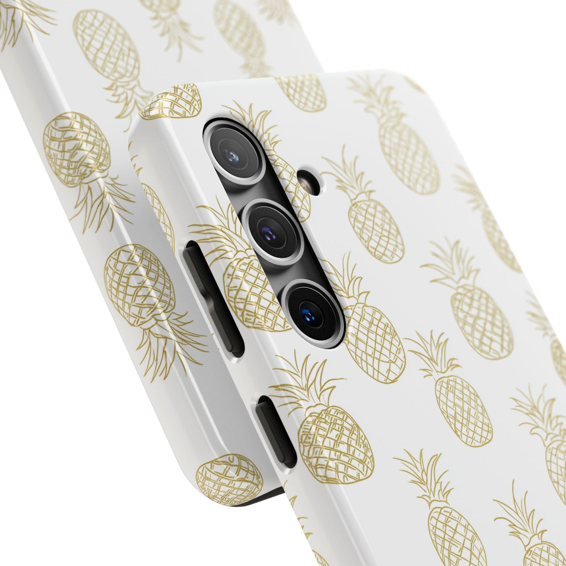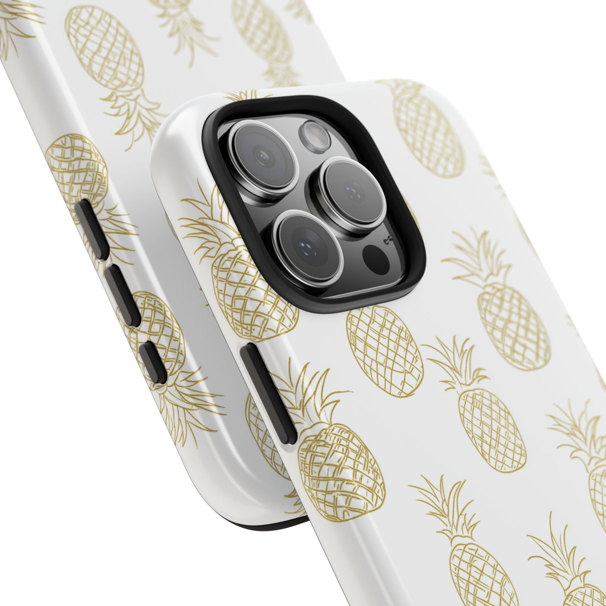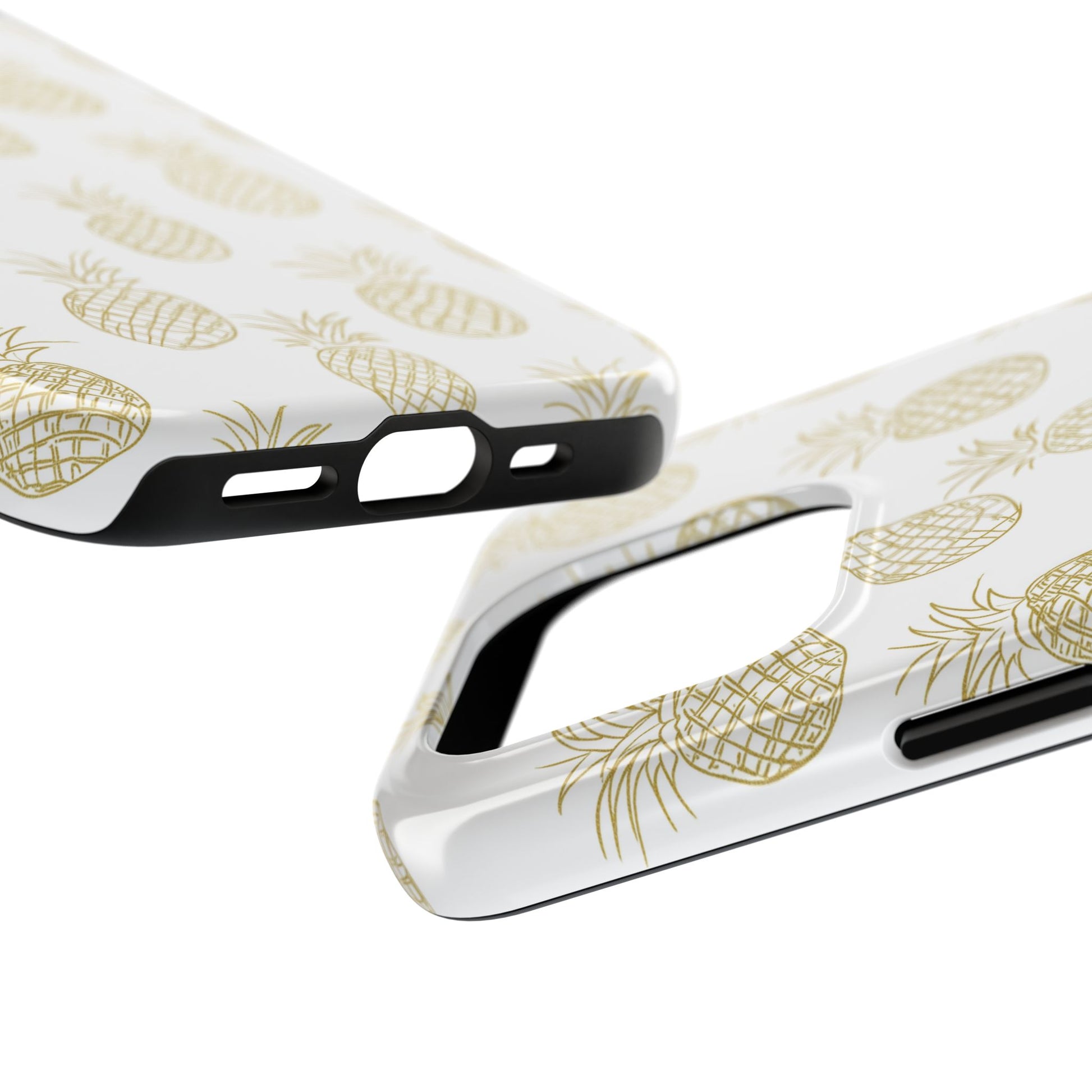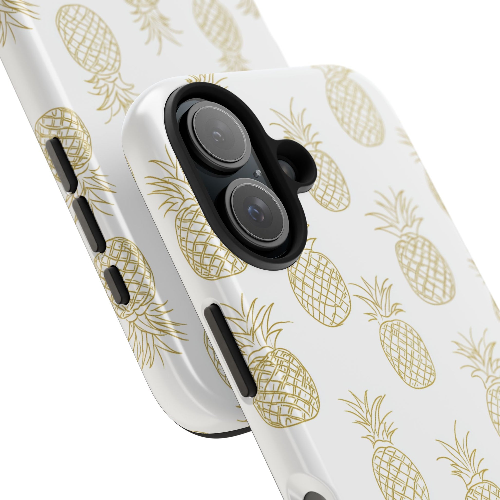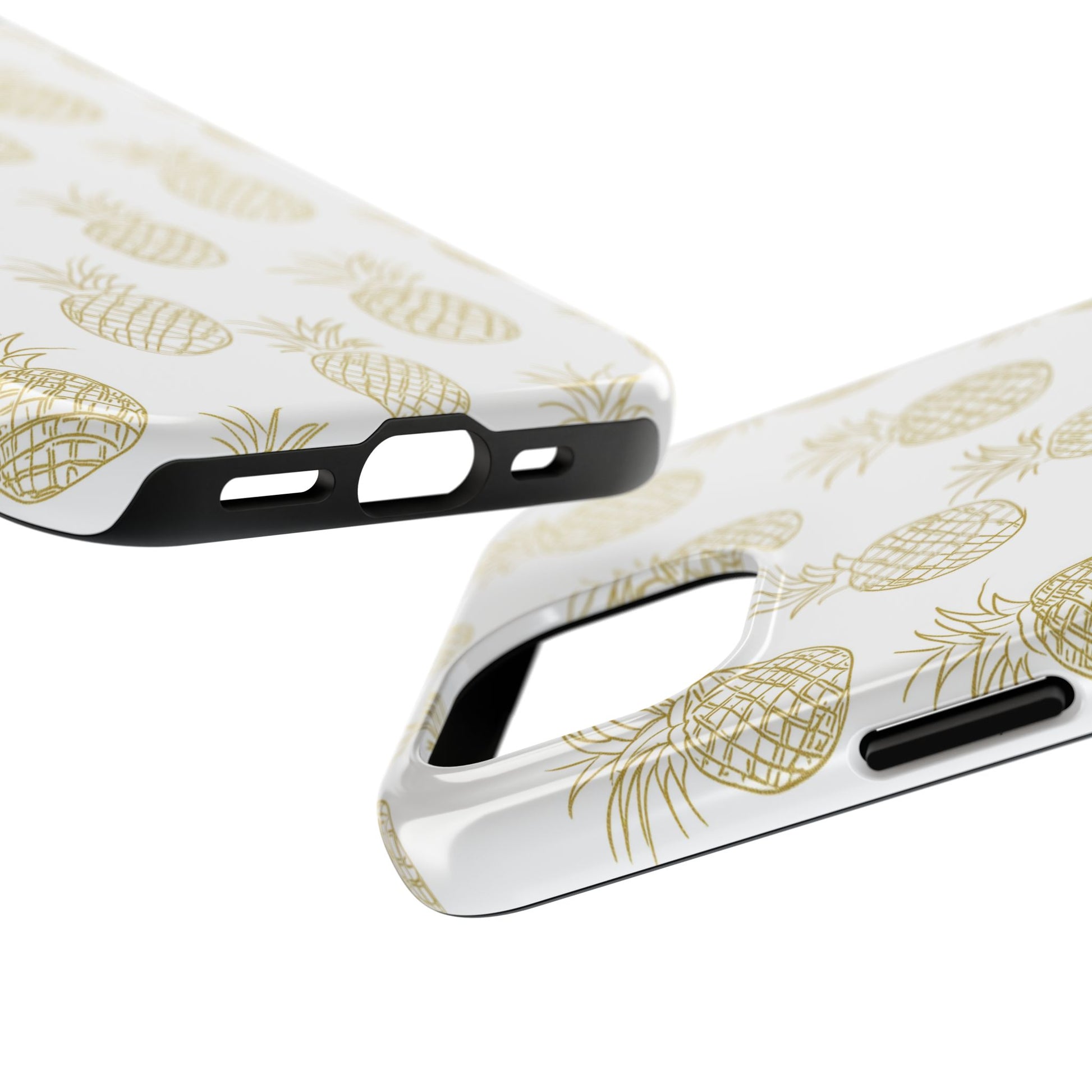 A stylish and elegant phone case featuring a golden pineapple print. This tough phone case is designed to protect your phone from impacts and scratches while adding a touch of tropical flair. Perfect for those who love fruity designs and want to keep their phone safe in style. Ideal for summer, beach holidays, and everyday use.