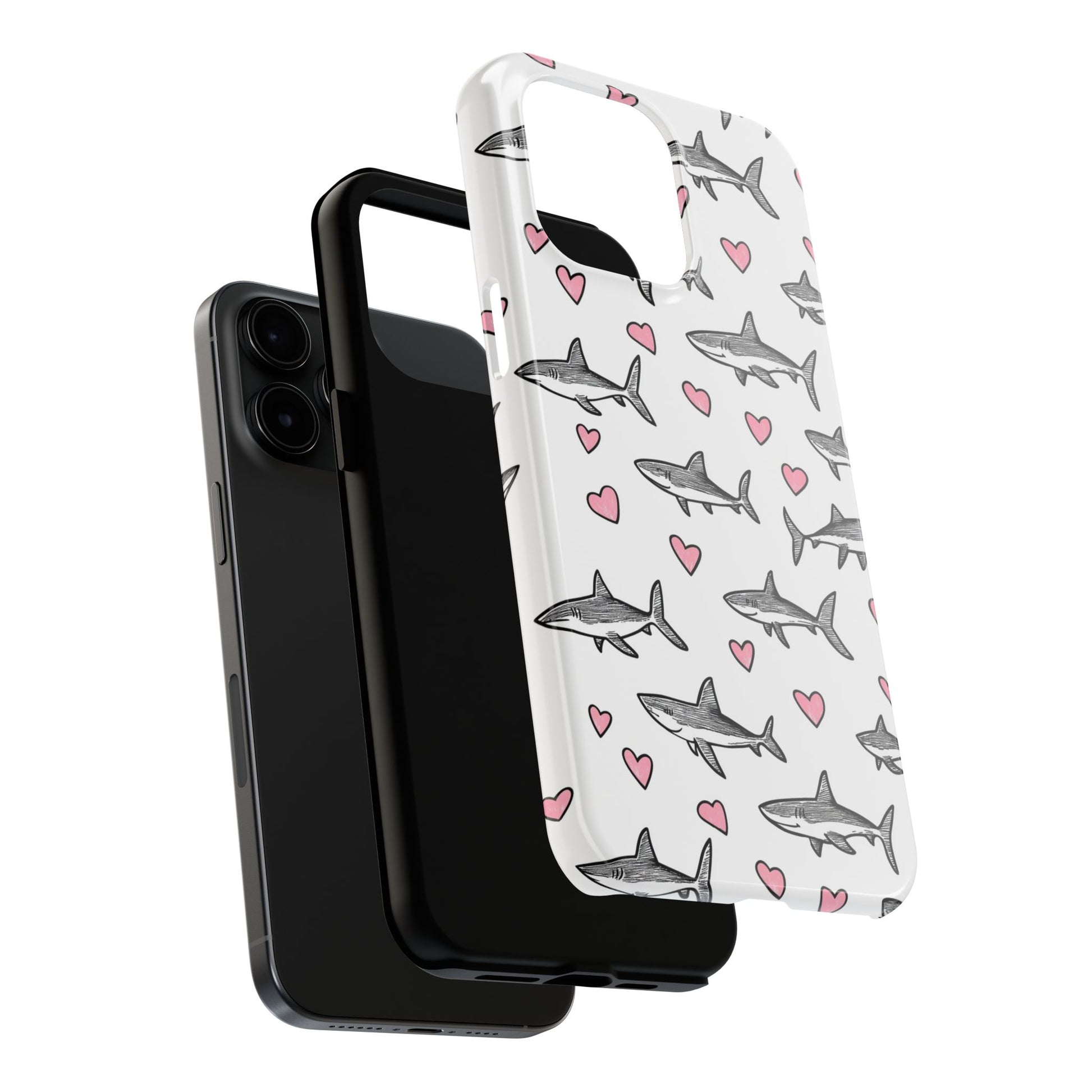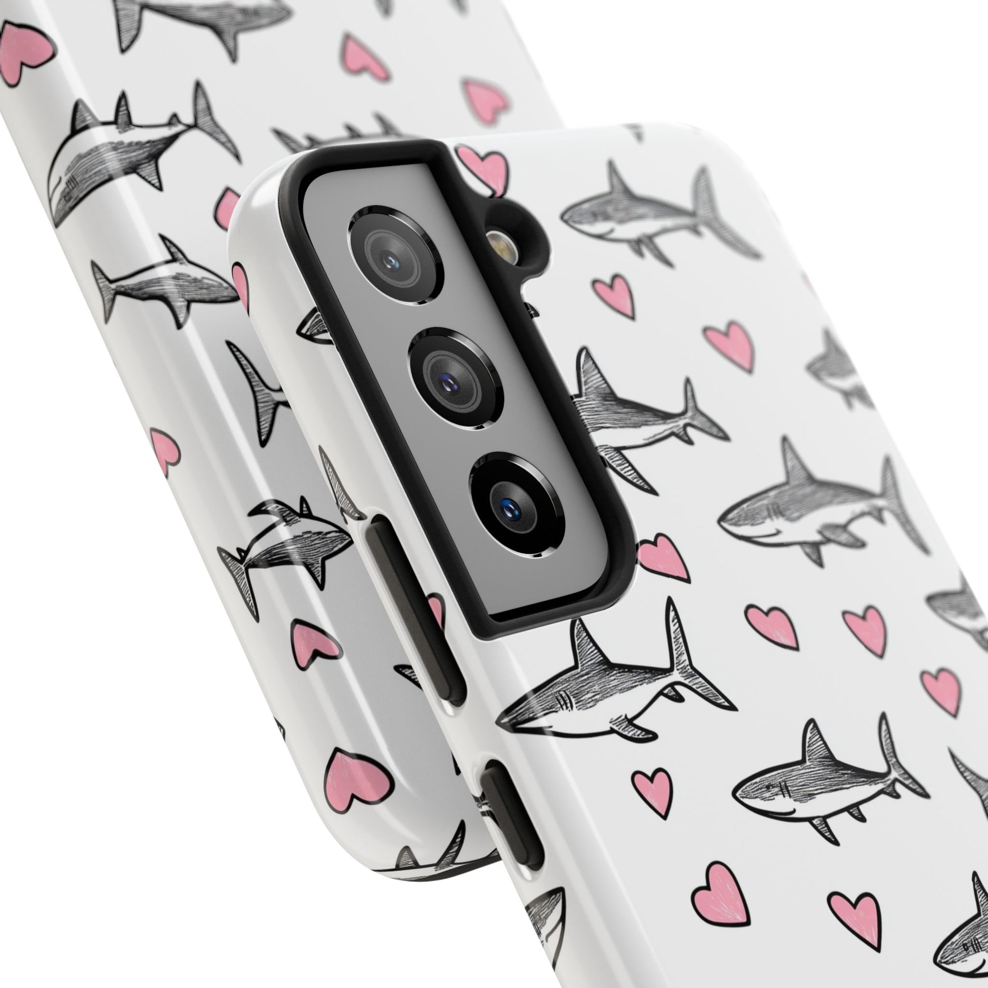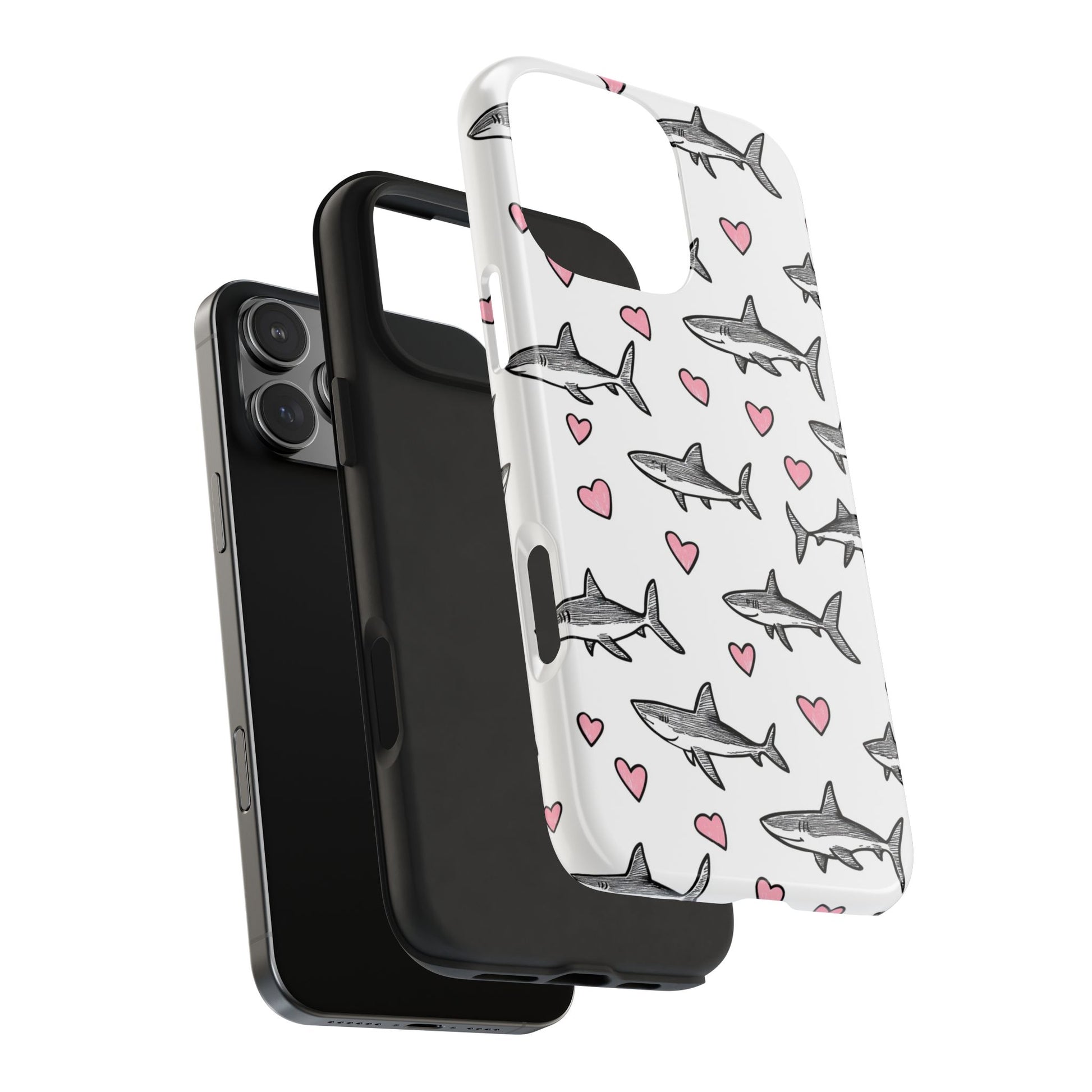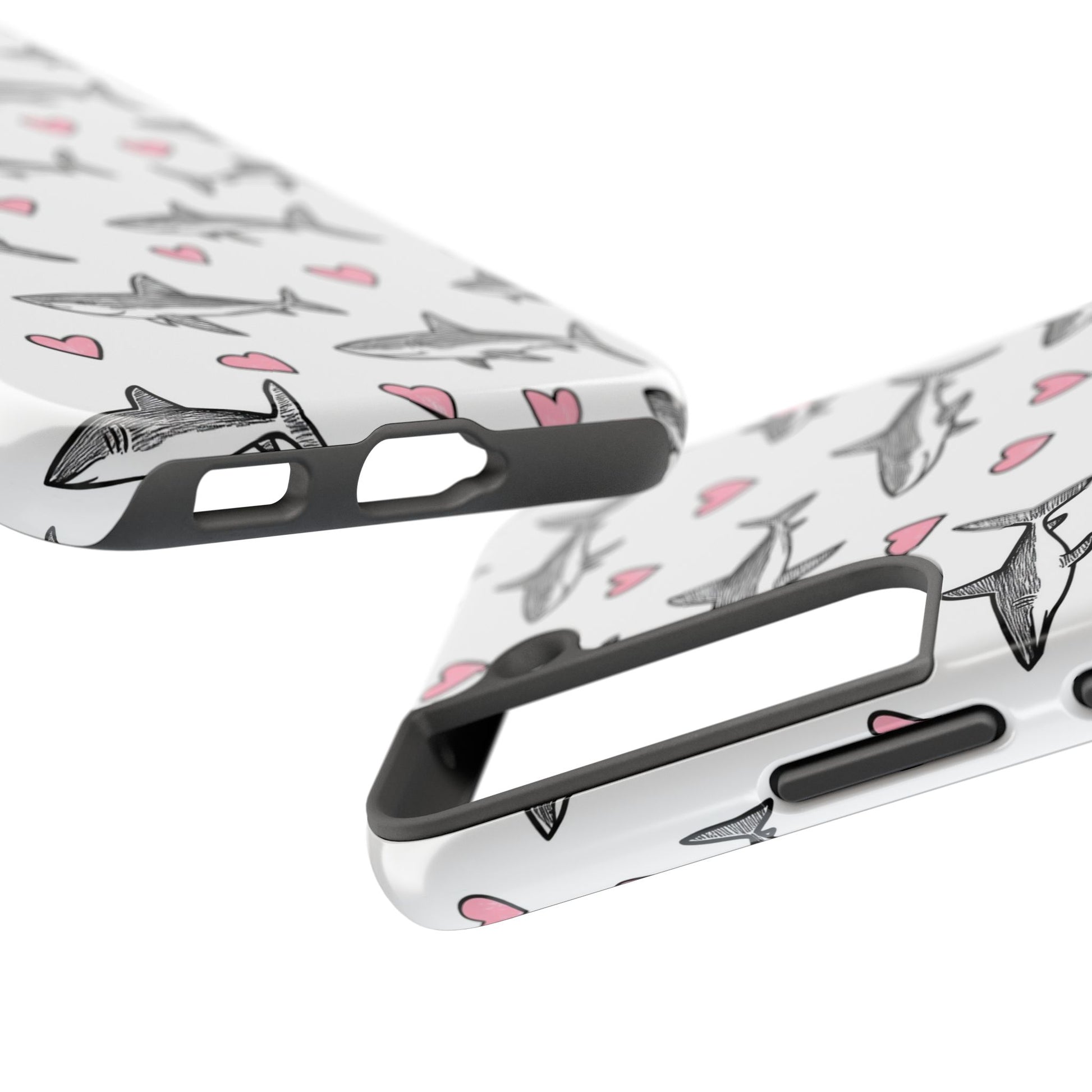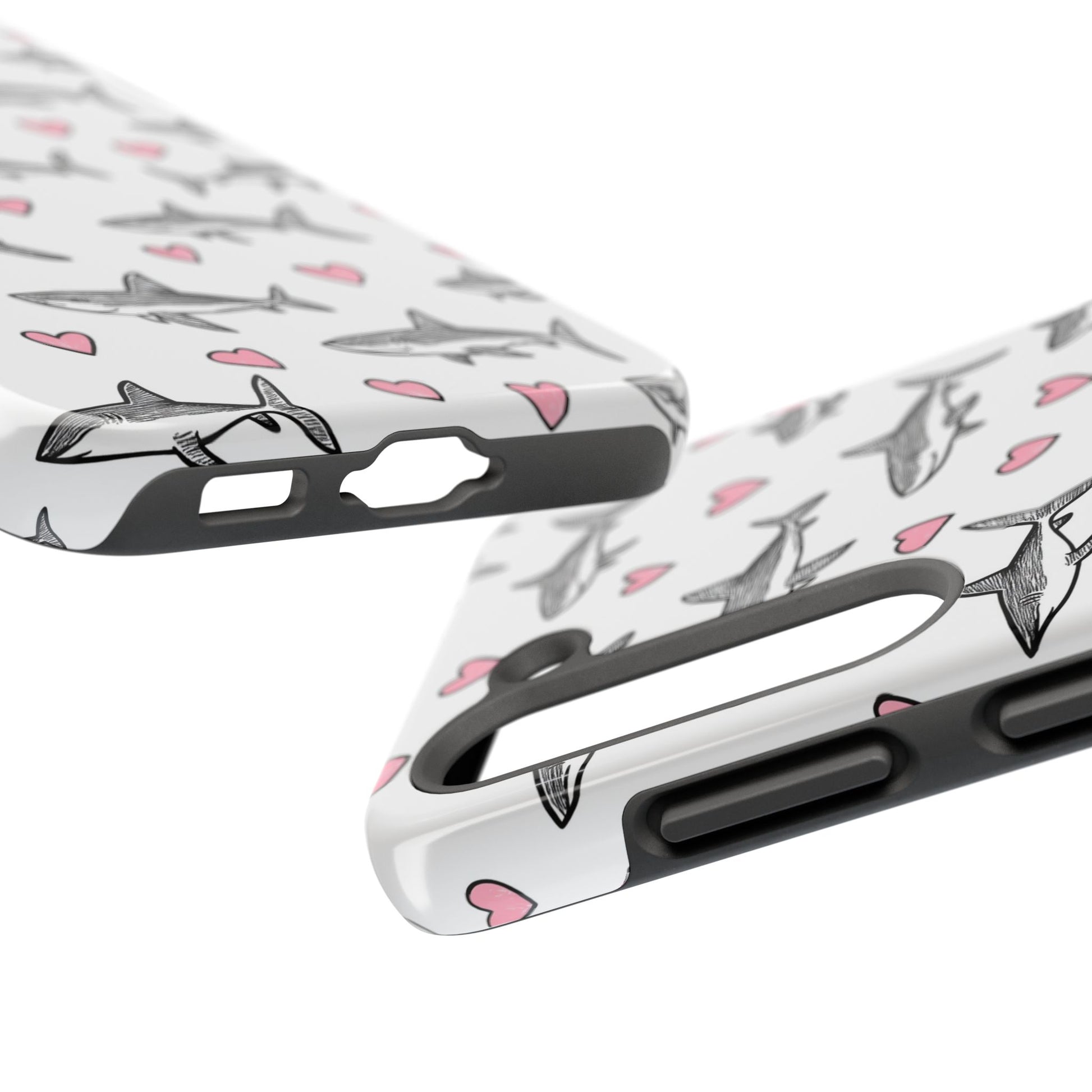 Stylish and durable phone cases featuring a design of sharks and hearts. These tough phone cases are perfect for those who want to protect their phone in style. Great for anyone who loves marine life or has a bold personality. Ideal for gifts on Valentine's Day or birthdays.