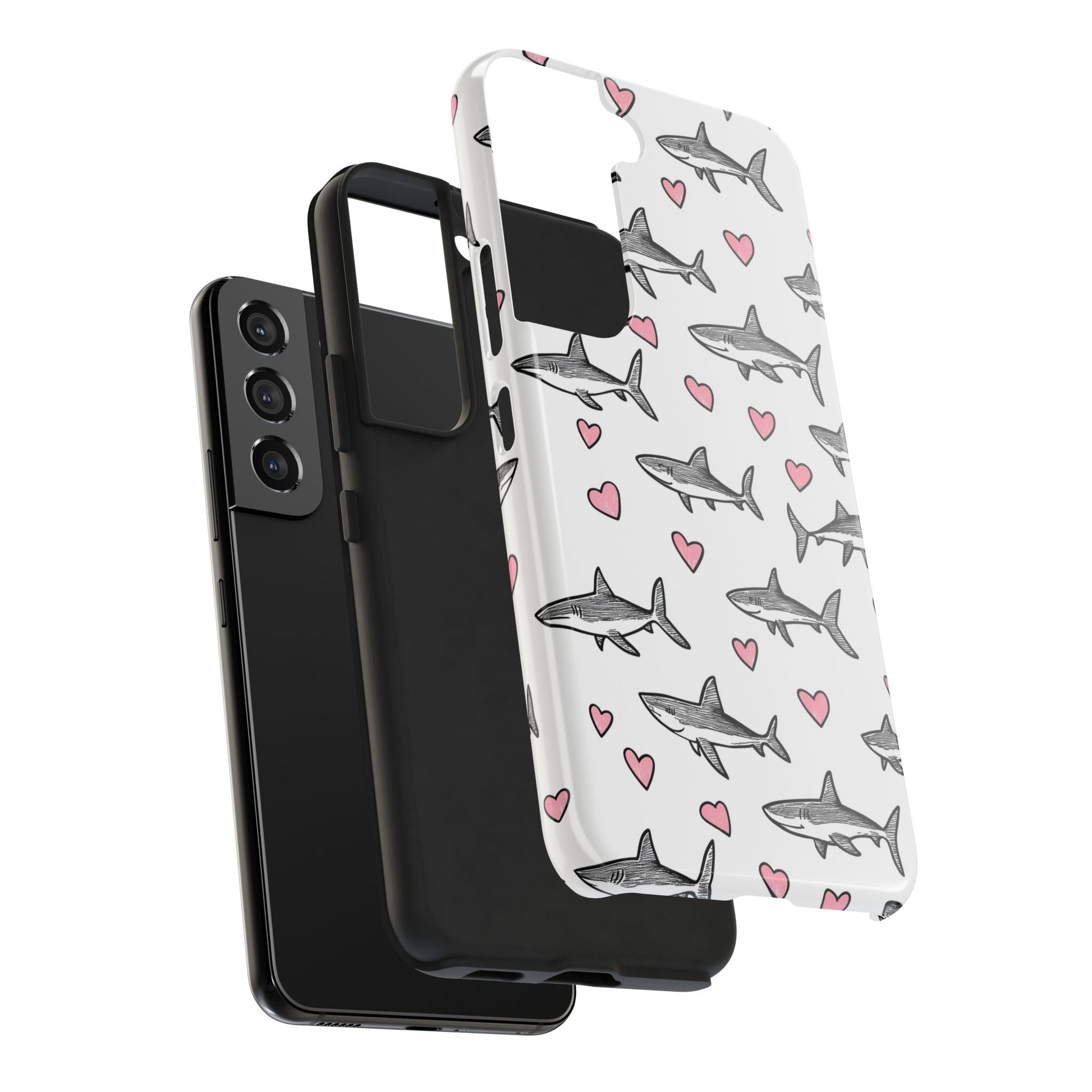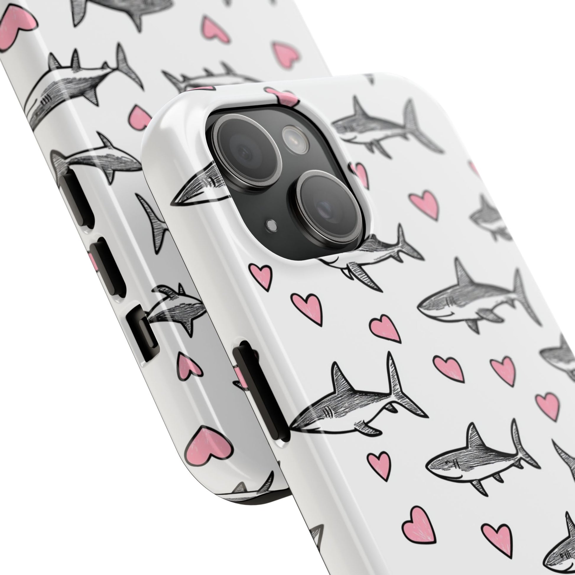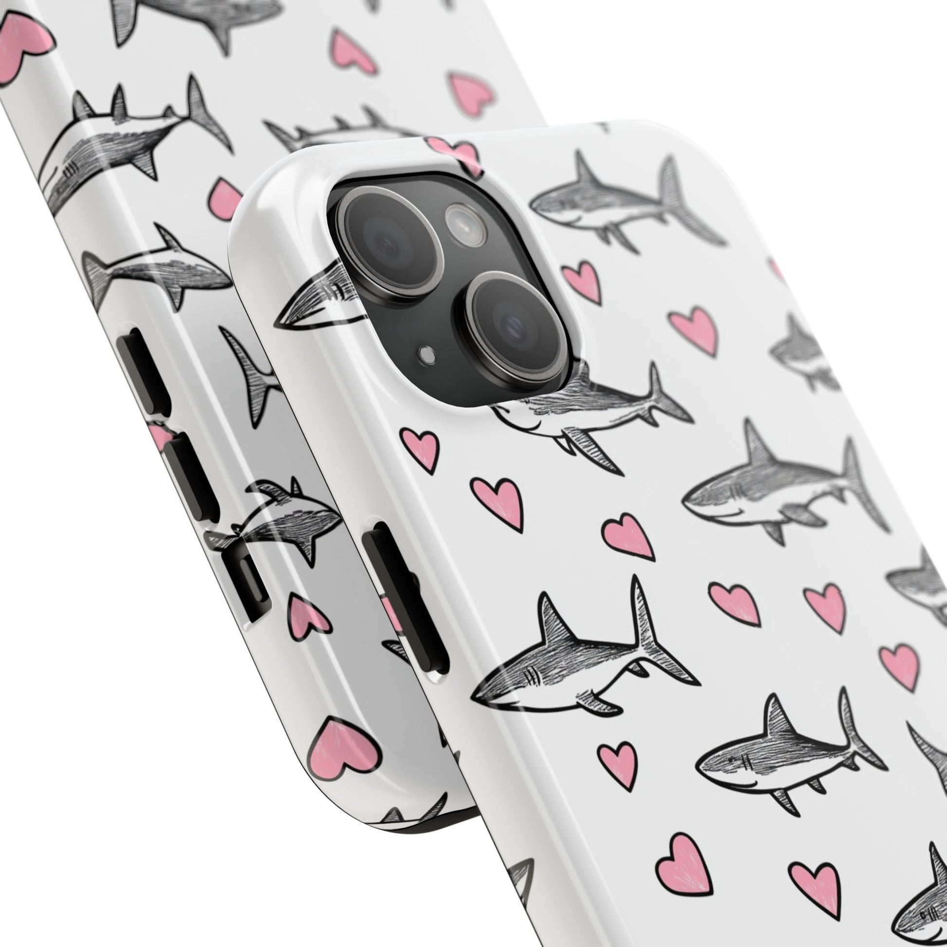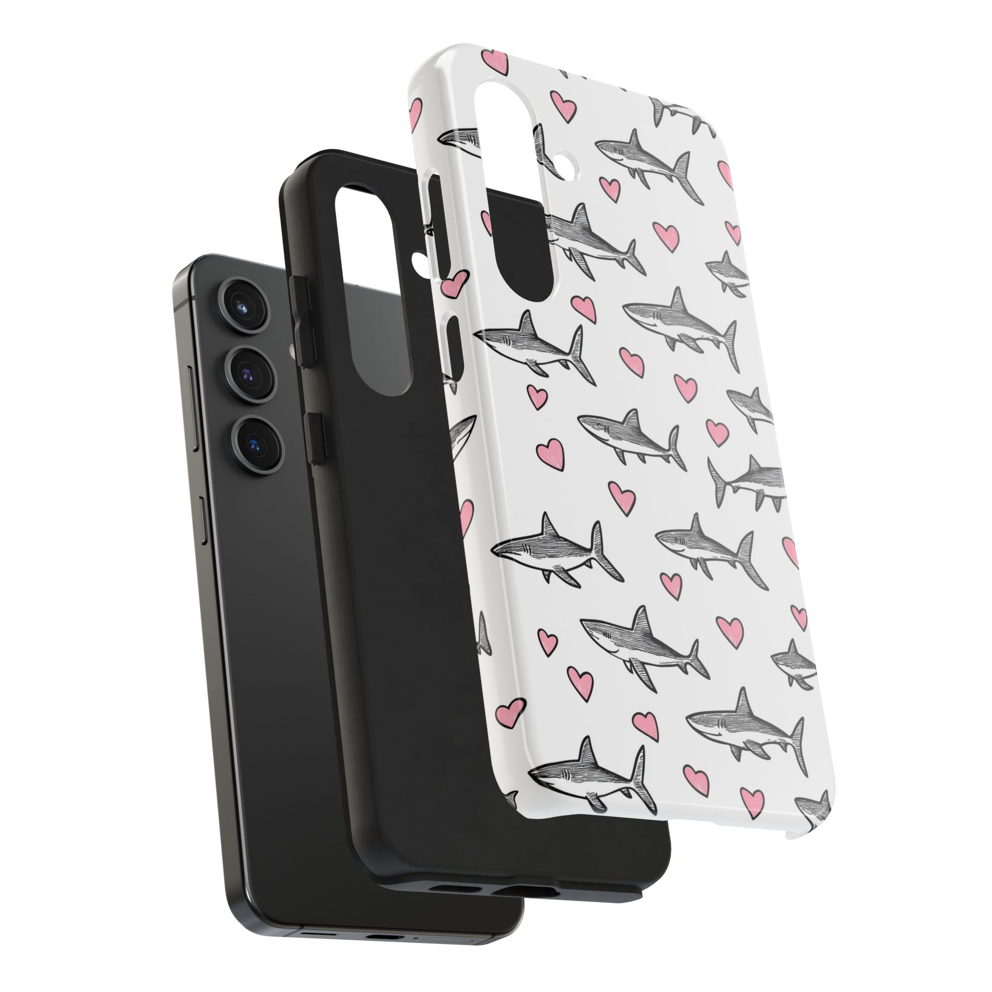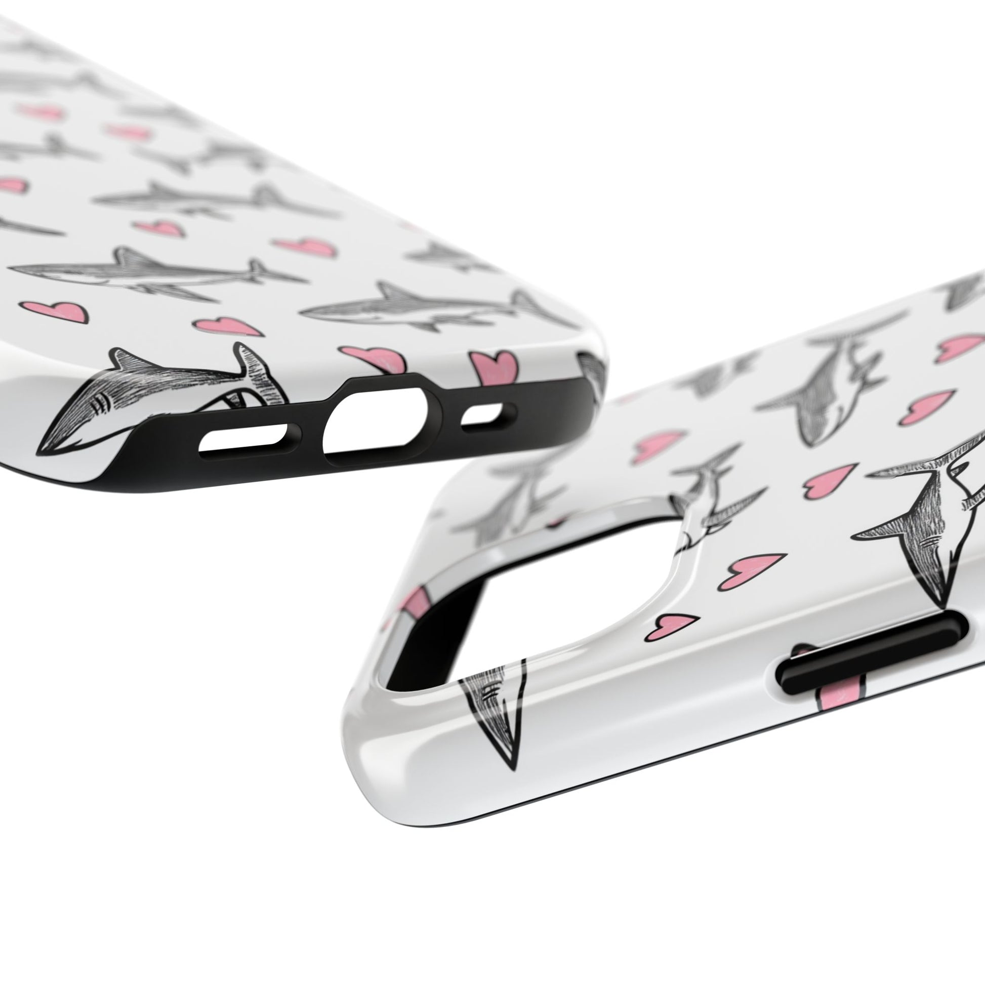 Stylish and durable phone cases featuring a design of sharks and hearts. These tough phone cases are perfect for those who want to protect their phone in style. Great for anyone who loves marine life or has a bold personality. Ideal for gifts on Valentine's Day or birthdays.