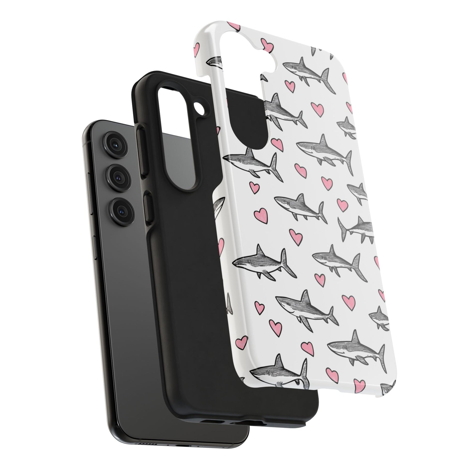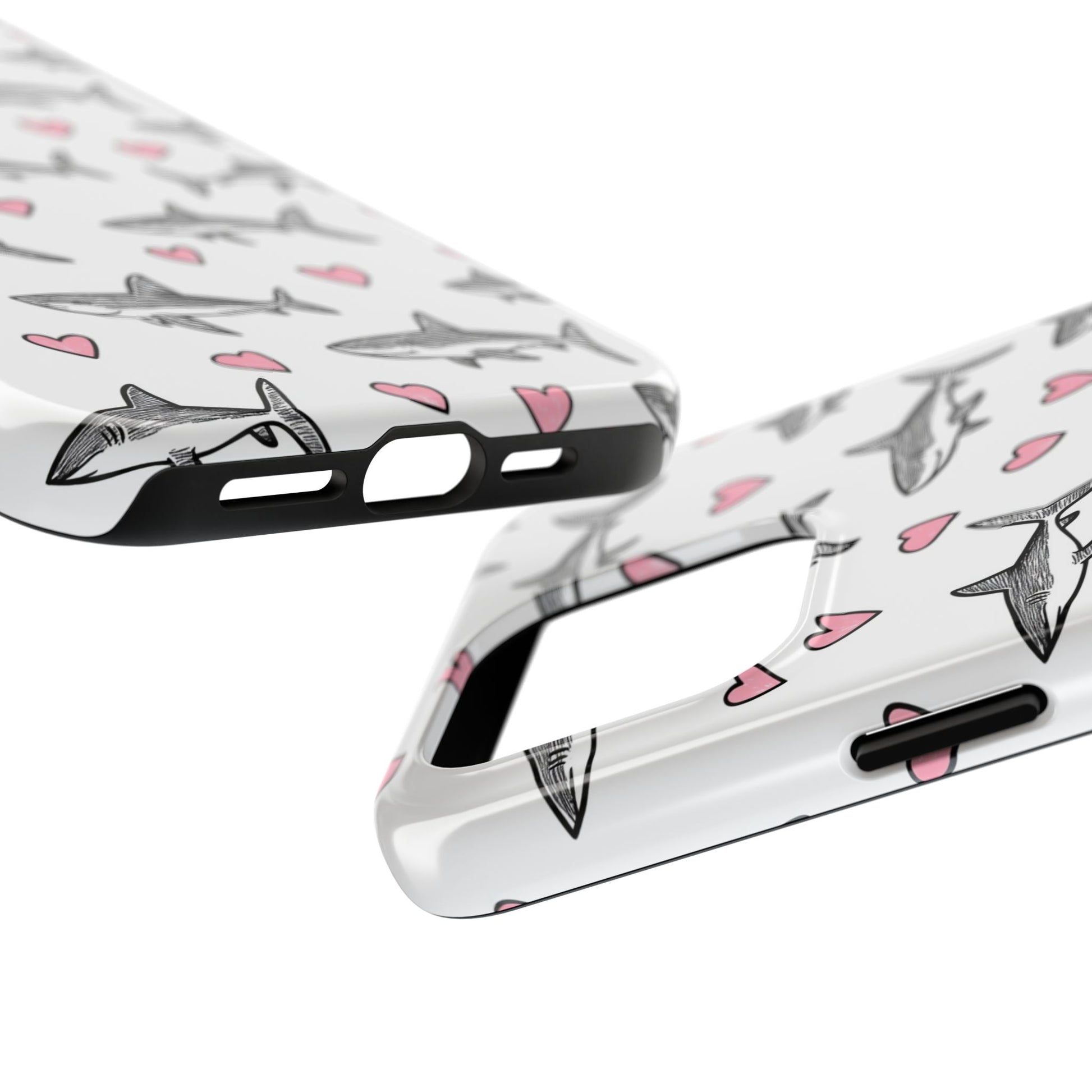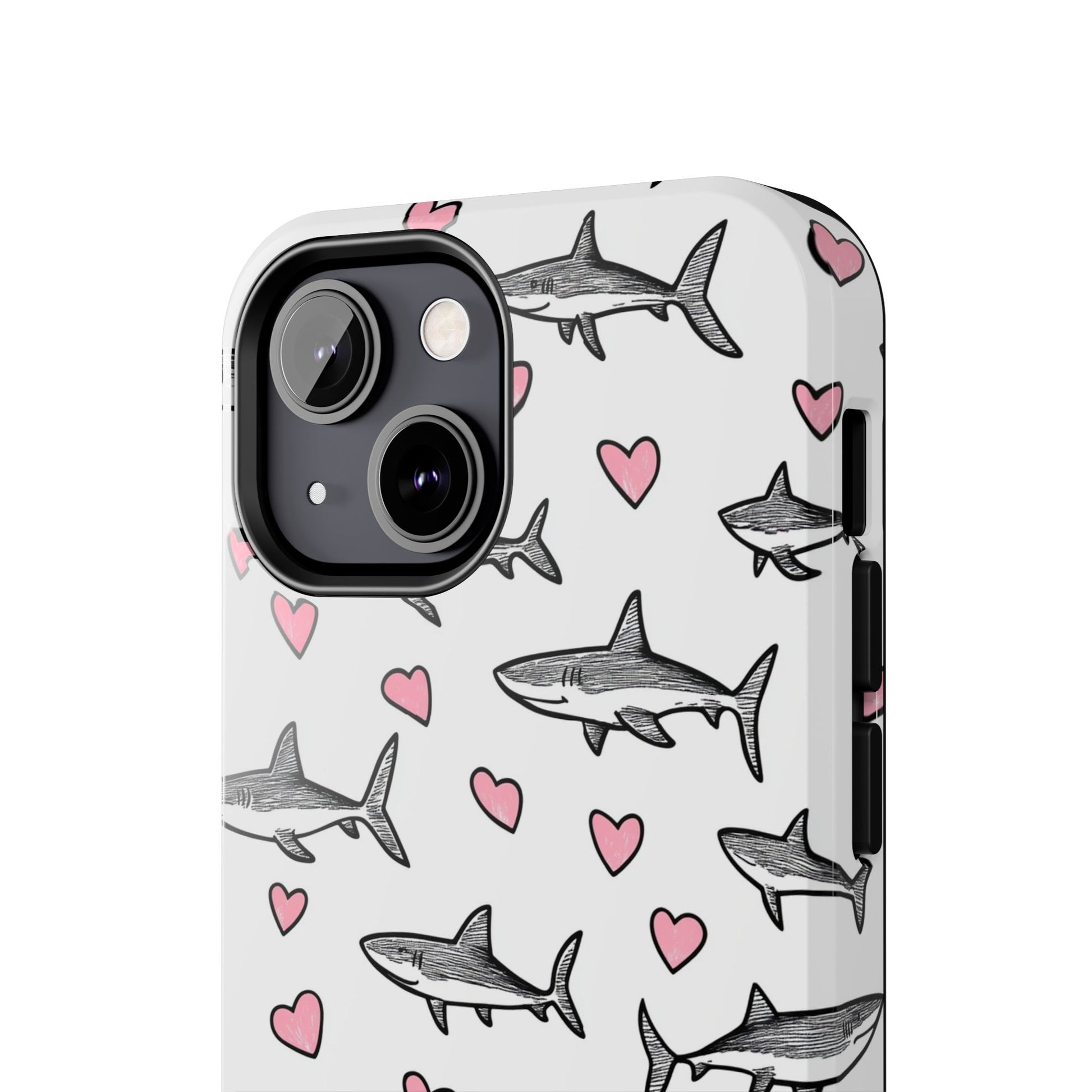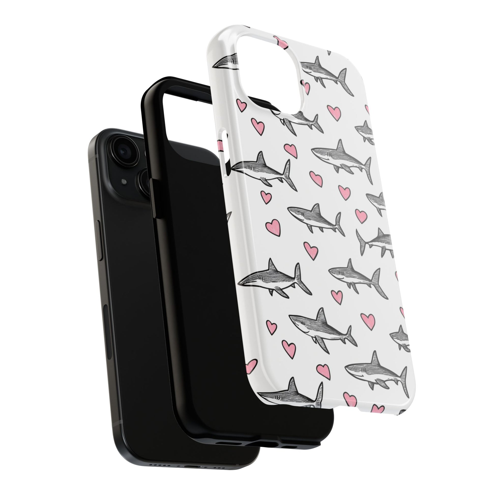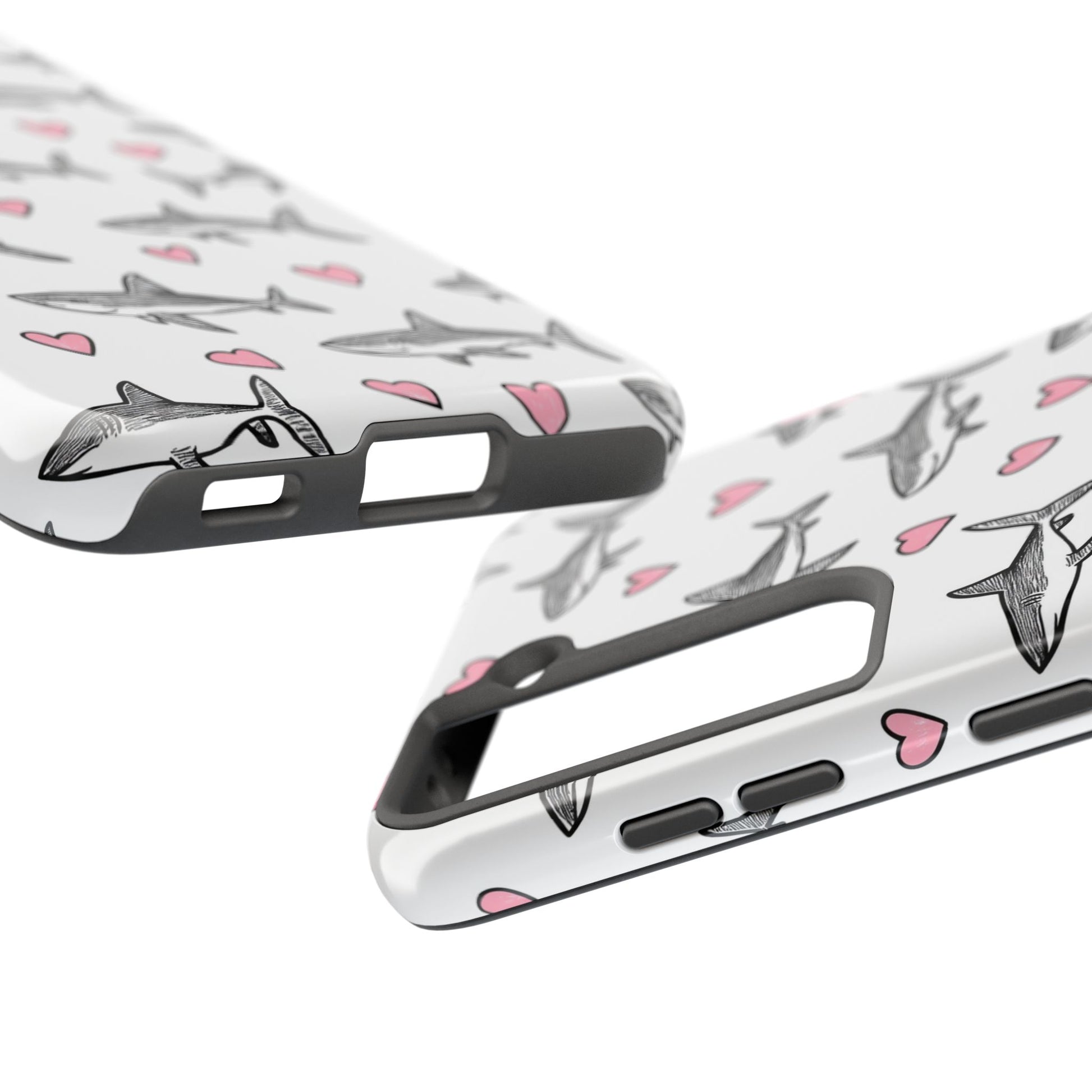 Stylish and durable phone cases featuring a design of sharks and hearts. These tough phone cases are perfect for those who want to protect their phone in style. Great for anyone who loves marine life or has a bold personality. Ideal for gifts on Valentine's Day or birthdays.