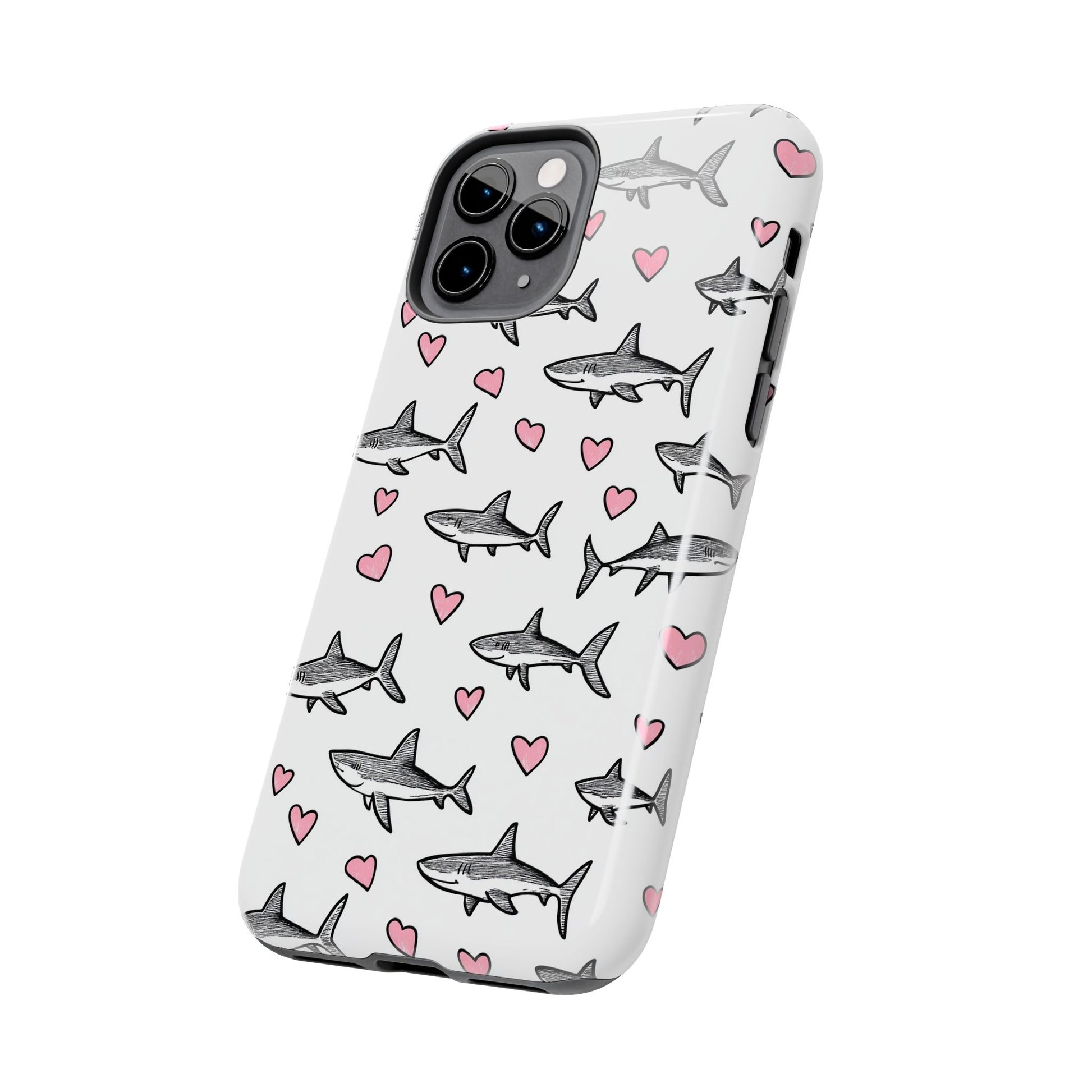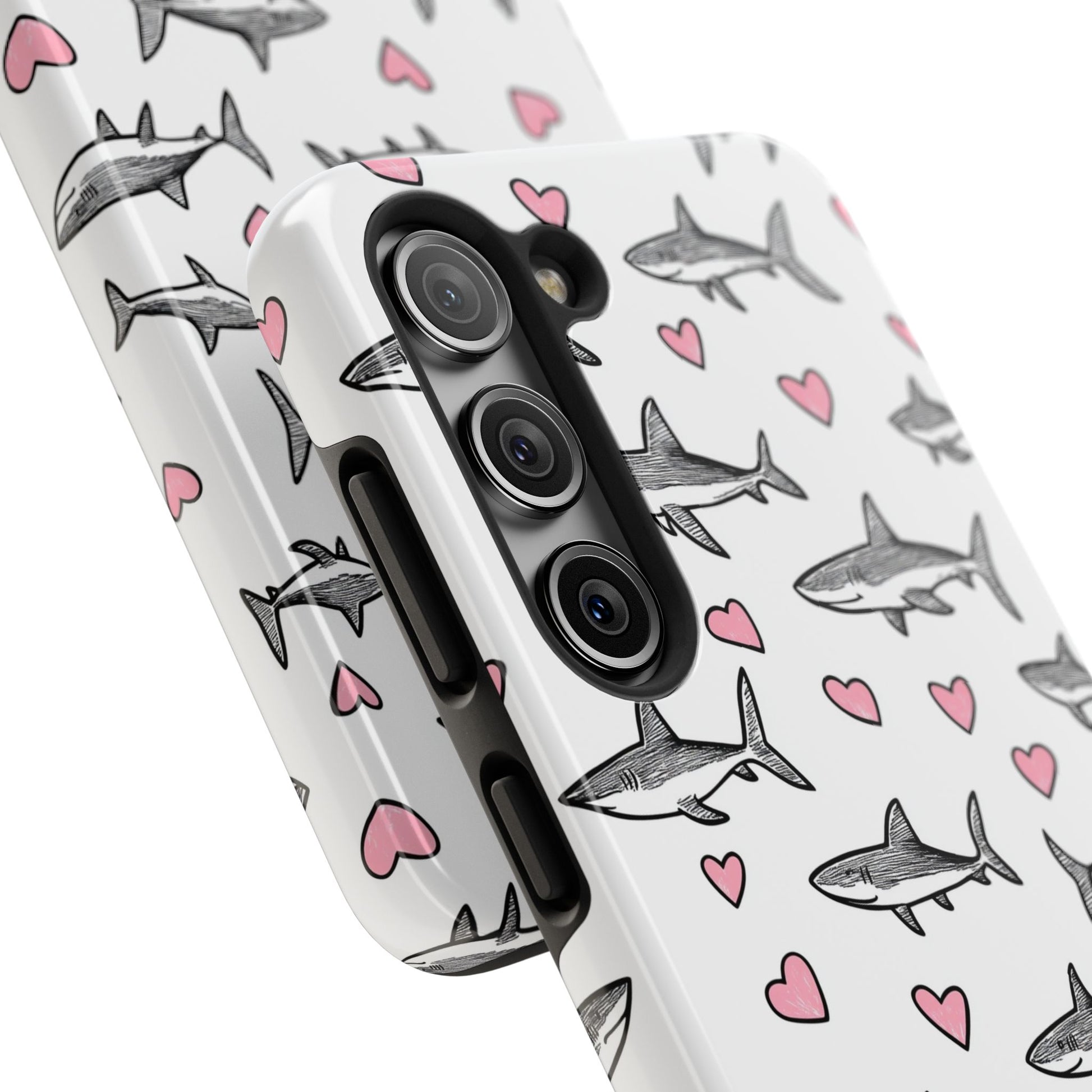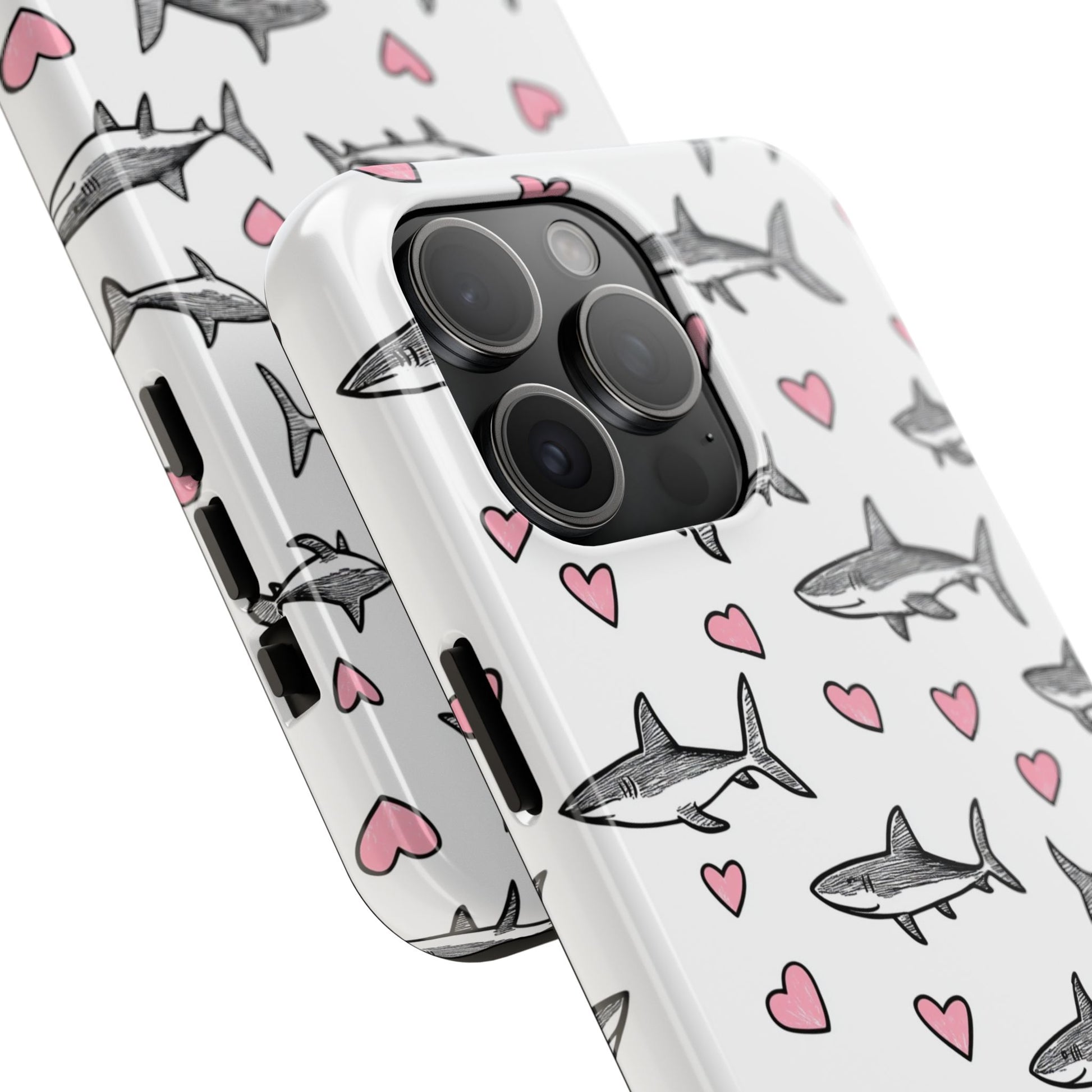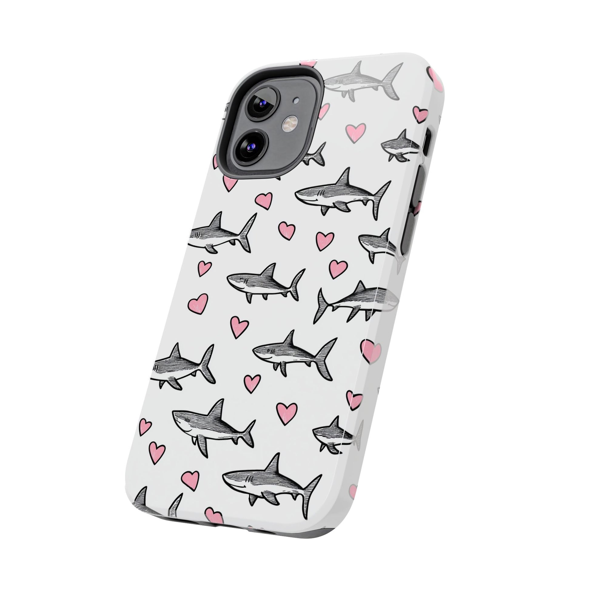 Stylish and durable phone cases featuring a design of sharks and hearts. These tough phone cases are perfect for those who want to protect their phone in style. Great for anyone who loves marine life or has a bold personality. Ideal for gifts on Valentine's Day or birthdays.
