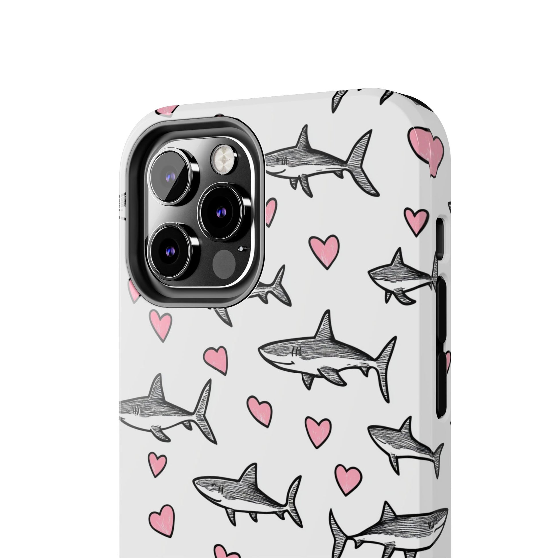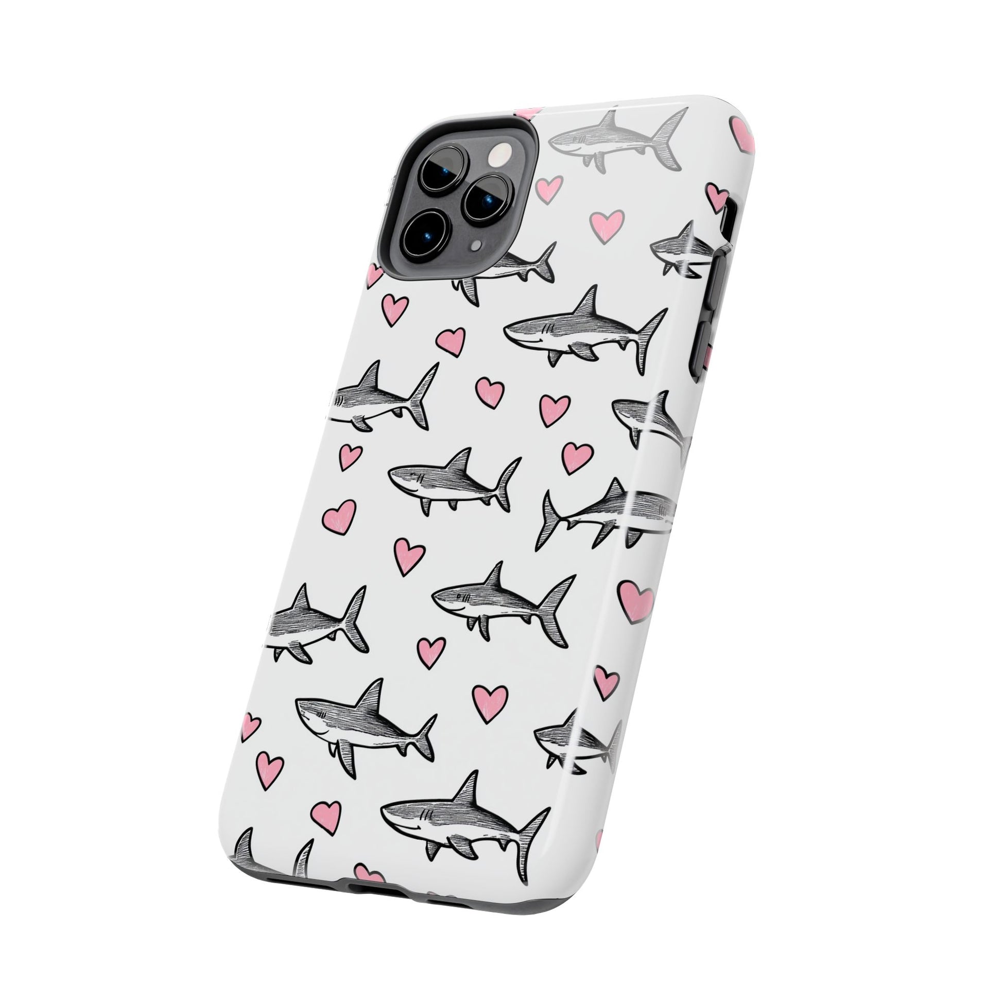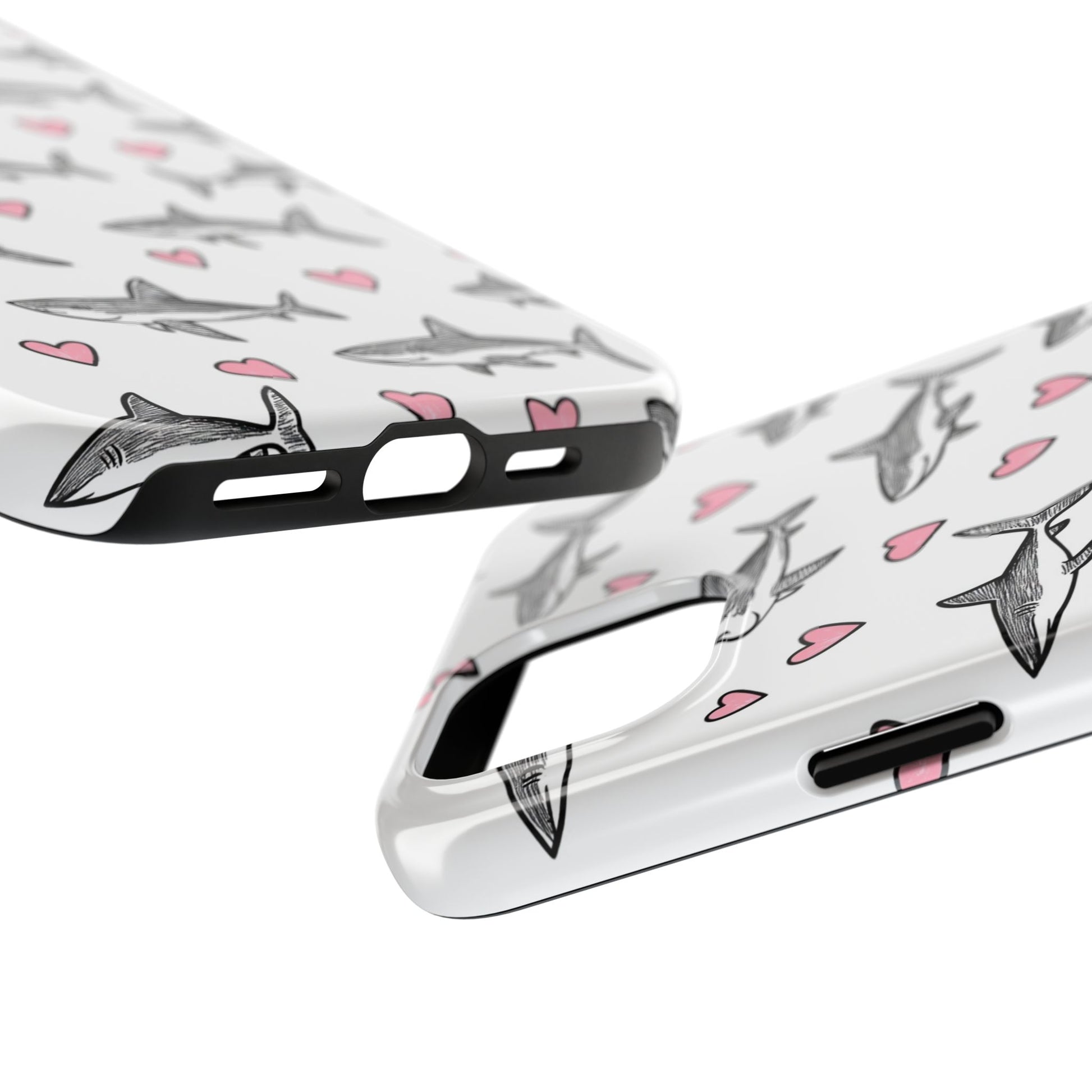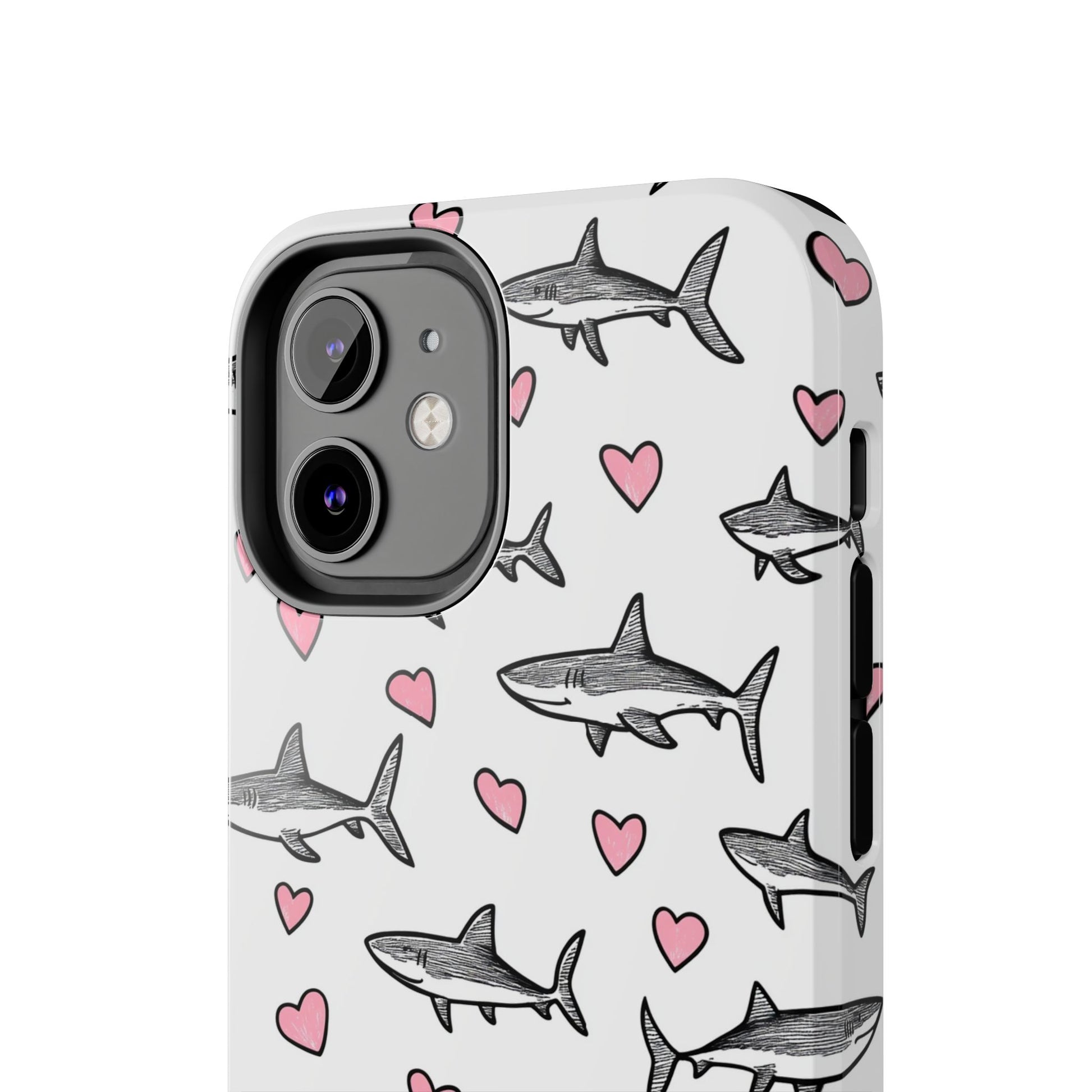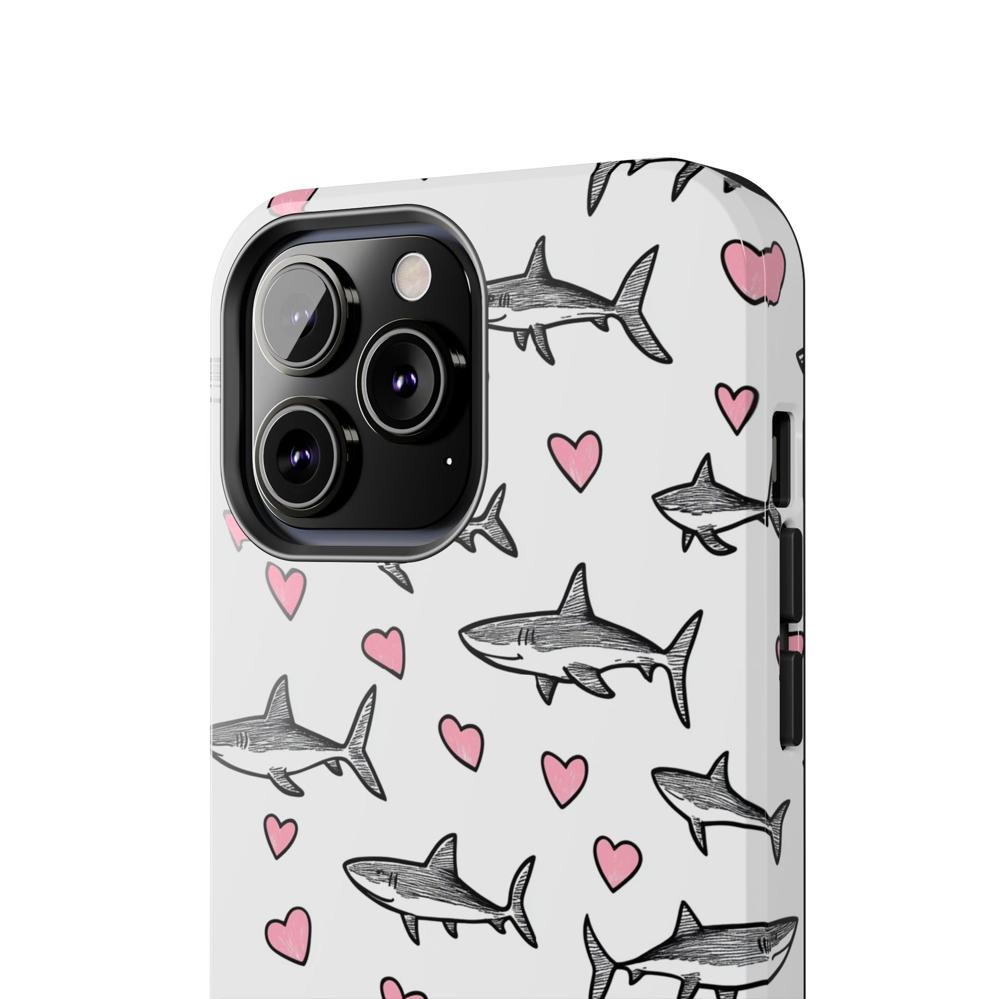 Stylish and durable phone cases featuring a design of sharks and hearts. These tough phone cases are perfect for those who want to protect their phone in style. Great for anyone who loves marine life or has a bold personality. Ideal for gifts on Valentine's Day or birthdays.
