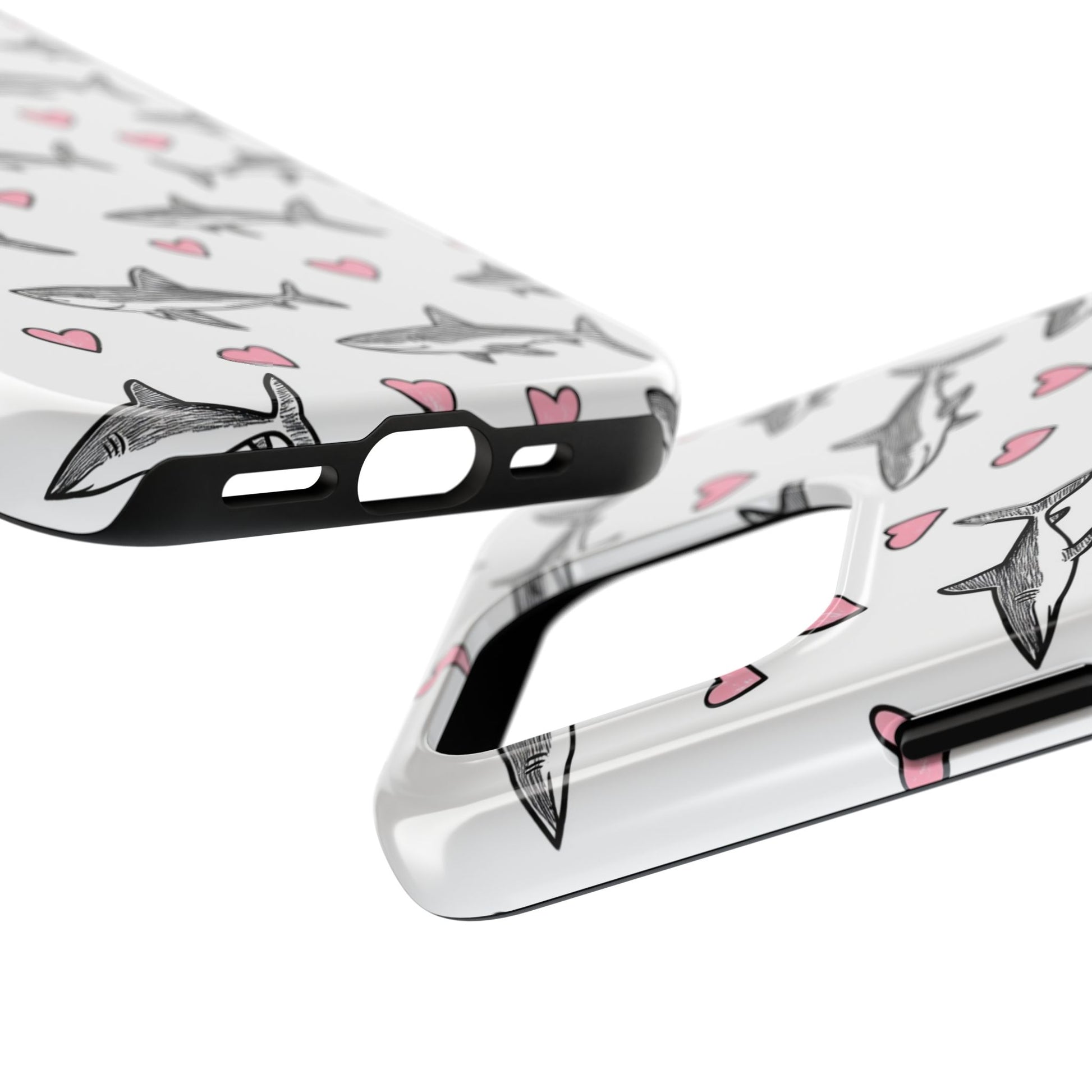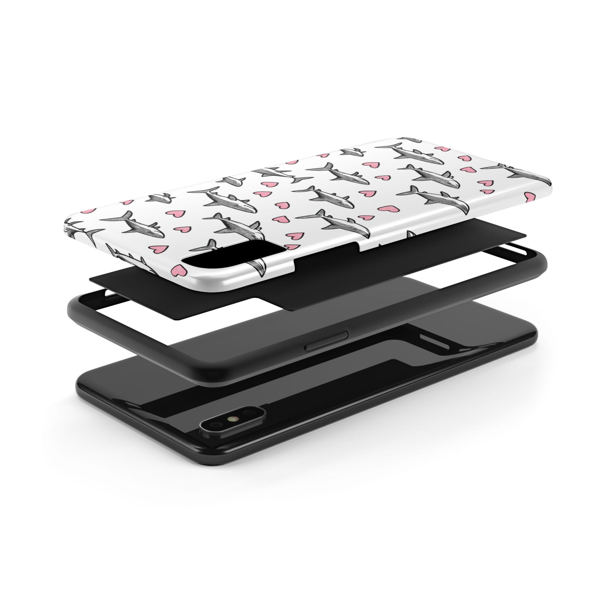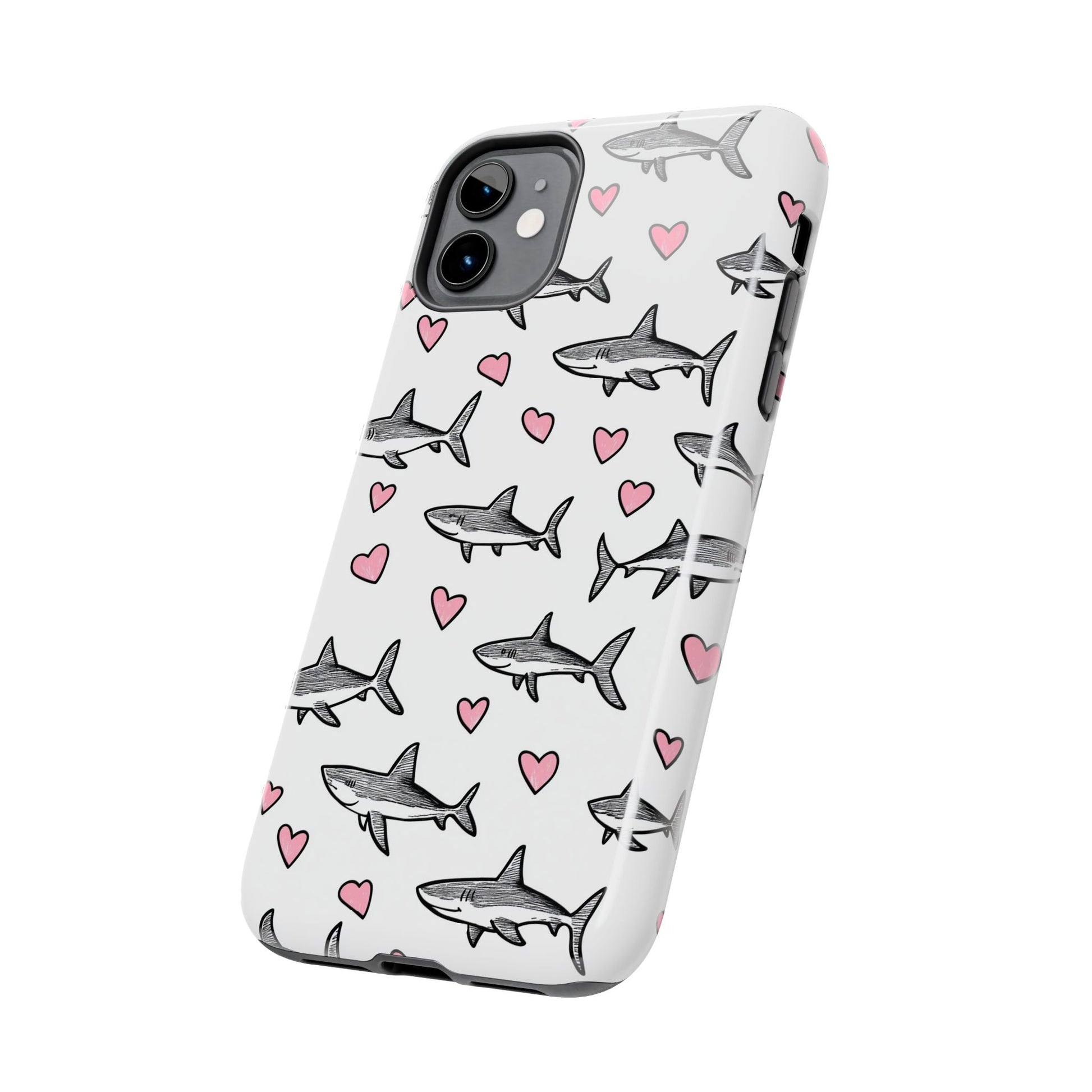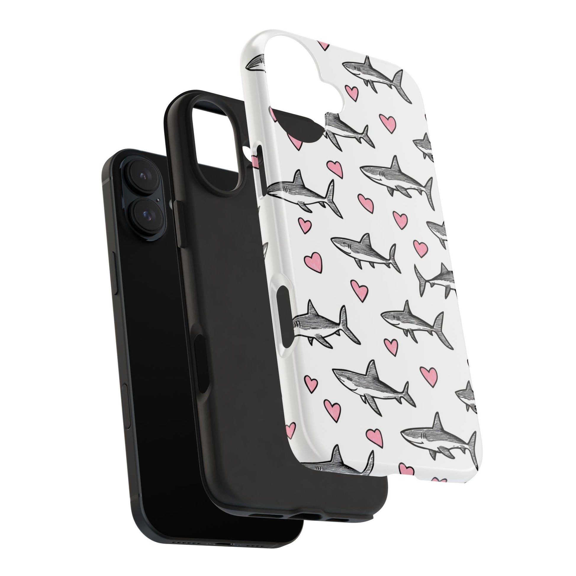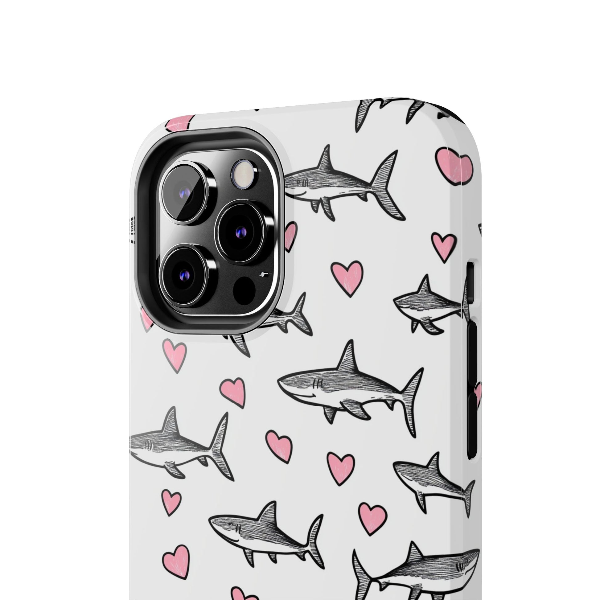 Stylish and durable phone cases featuring a design of sharks and hearts. These tough phone cases are perfect for those who want to protect their phone in style. Great for anyone who loves marine life or has a bold personality. Ideal for gifts on Valentine's Day or birthdays.