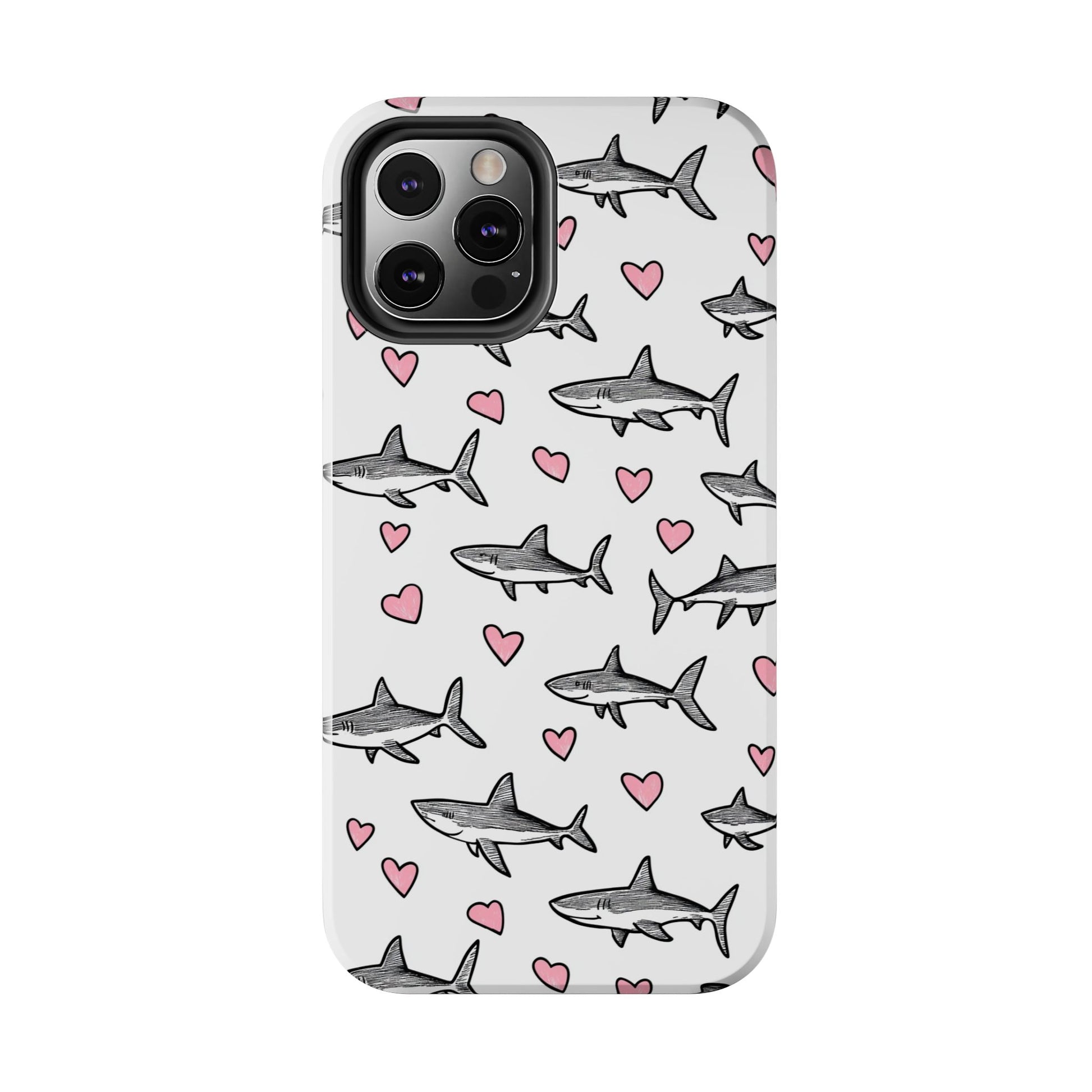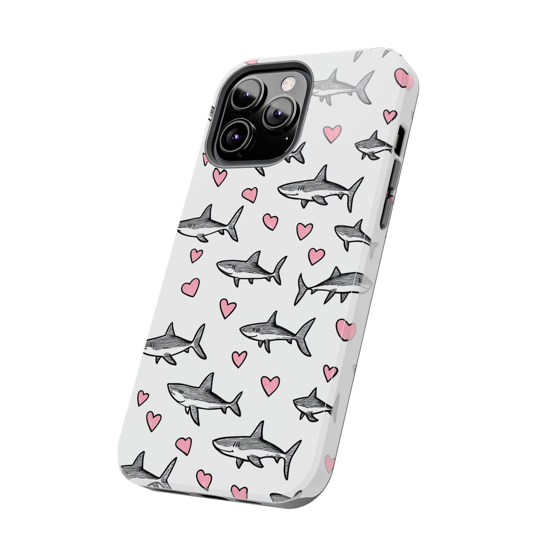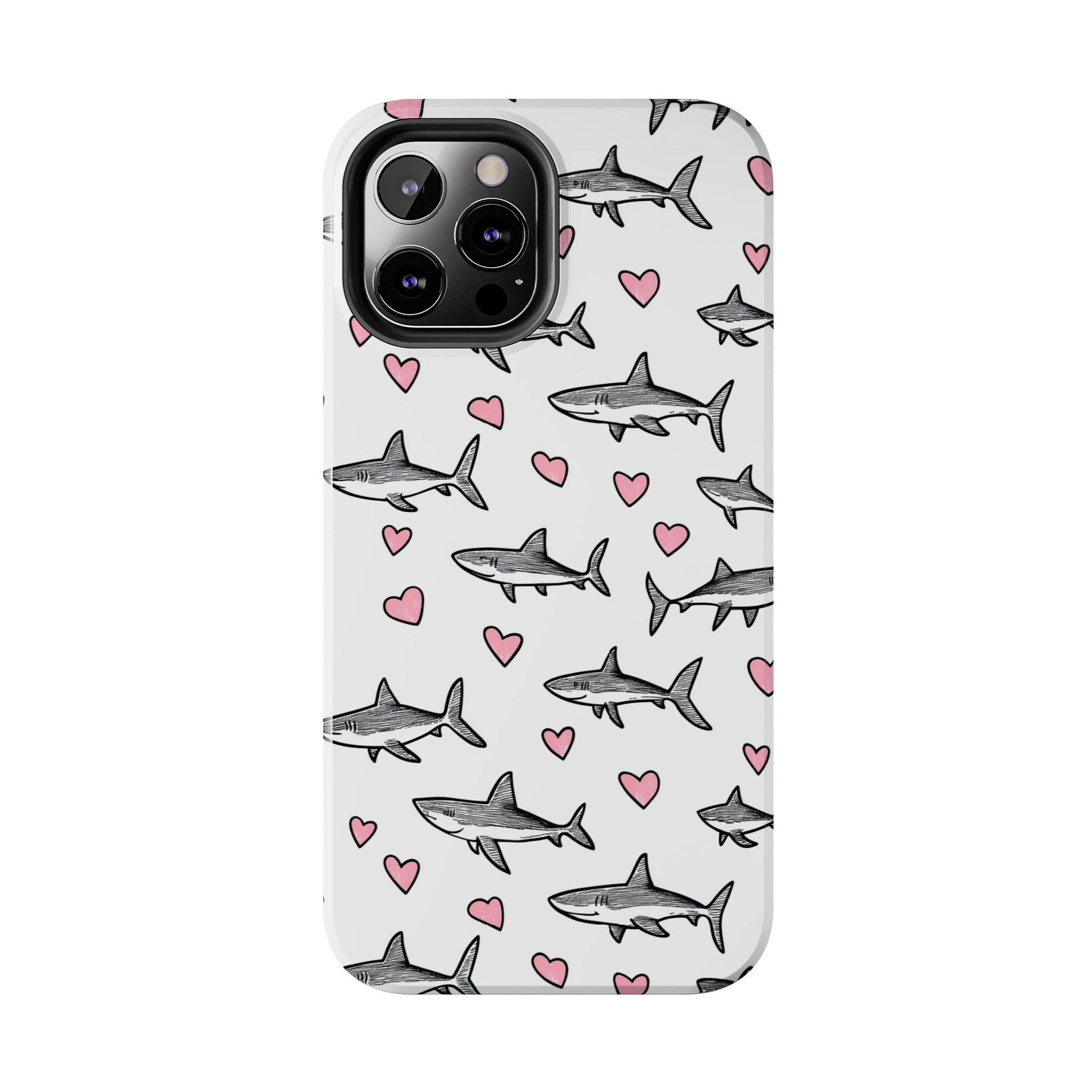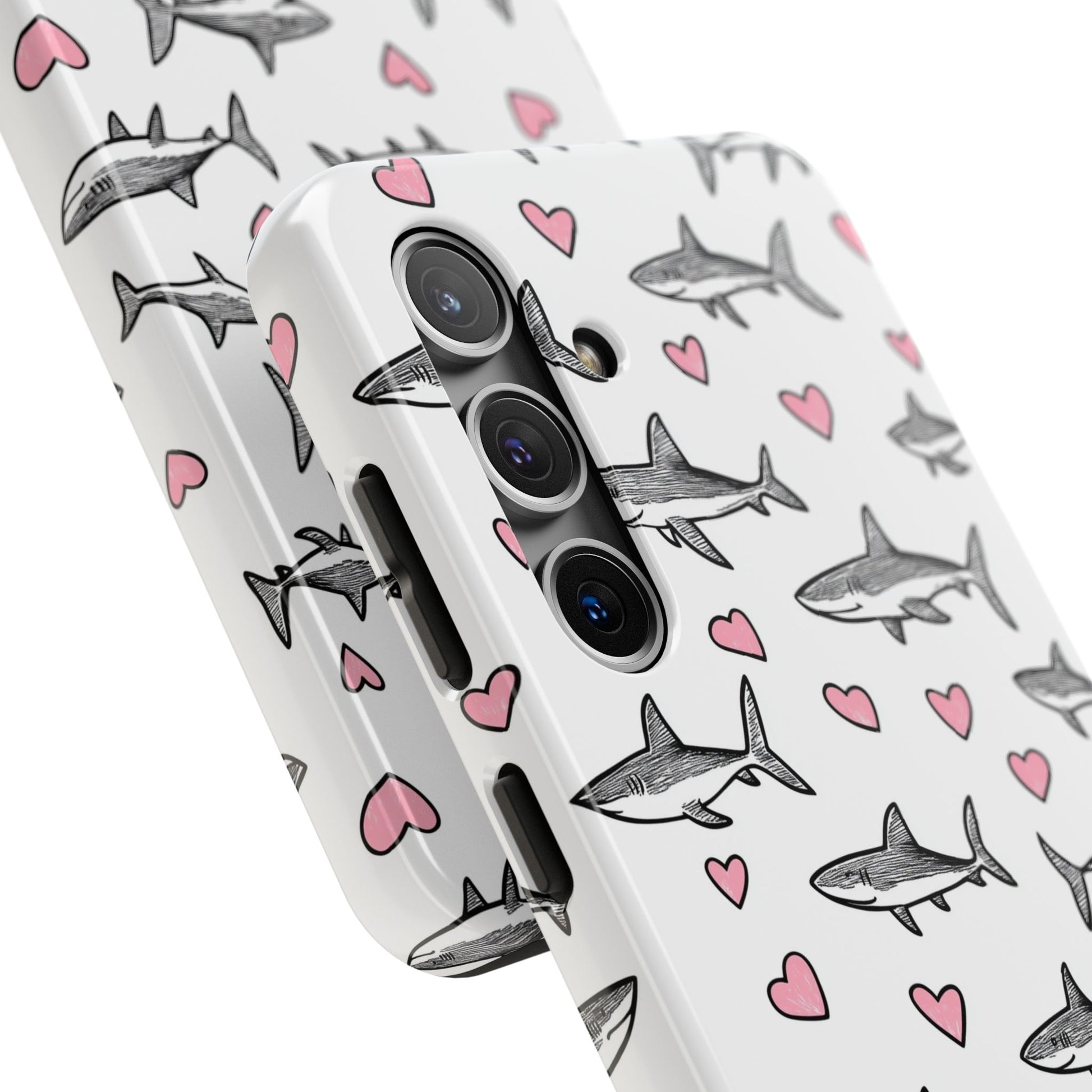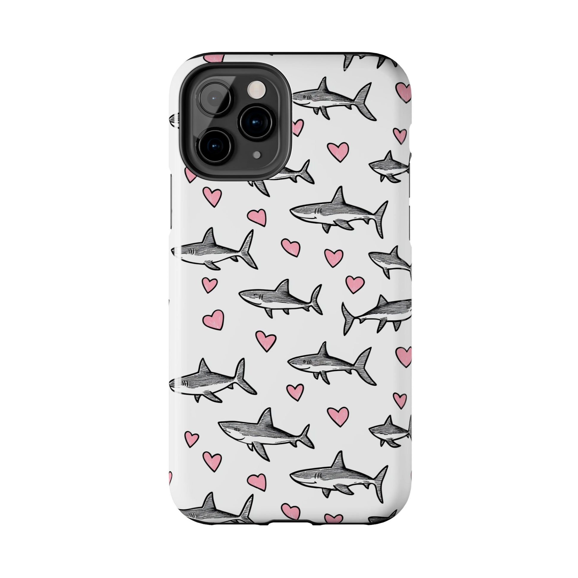 Stylish and durable phone cases featuring a design of sharks and hearts. These tough phone cases are perfect for those who want to protect their phone in style. Great for anyone who loves marine life or has a bold personality. Ideal for gifts on Valentine's Day or birthdays.