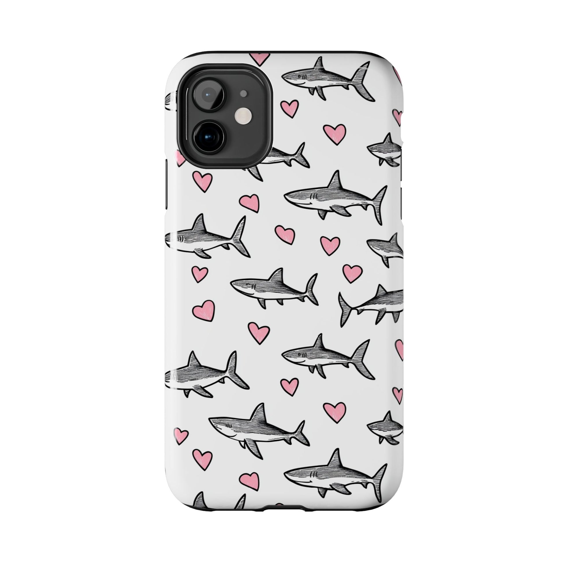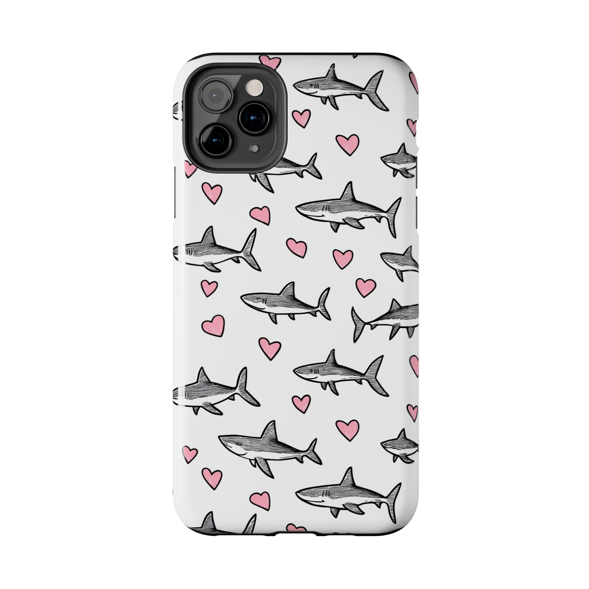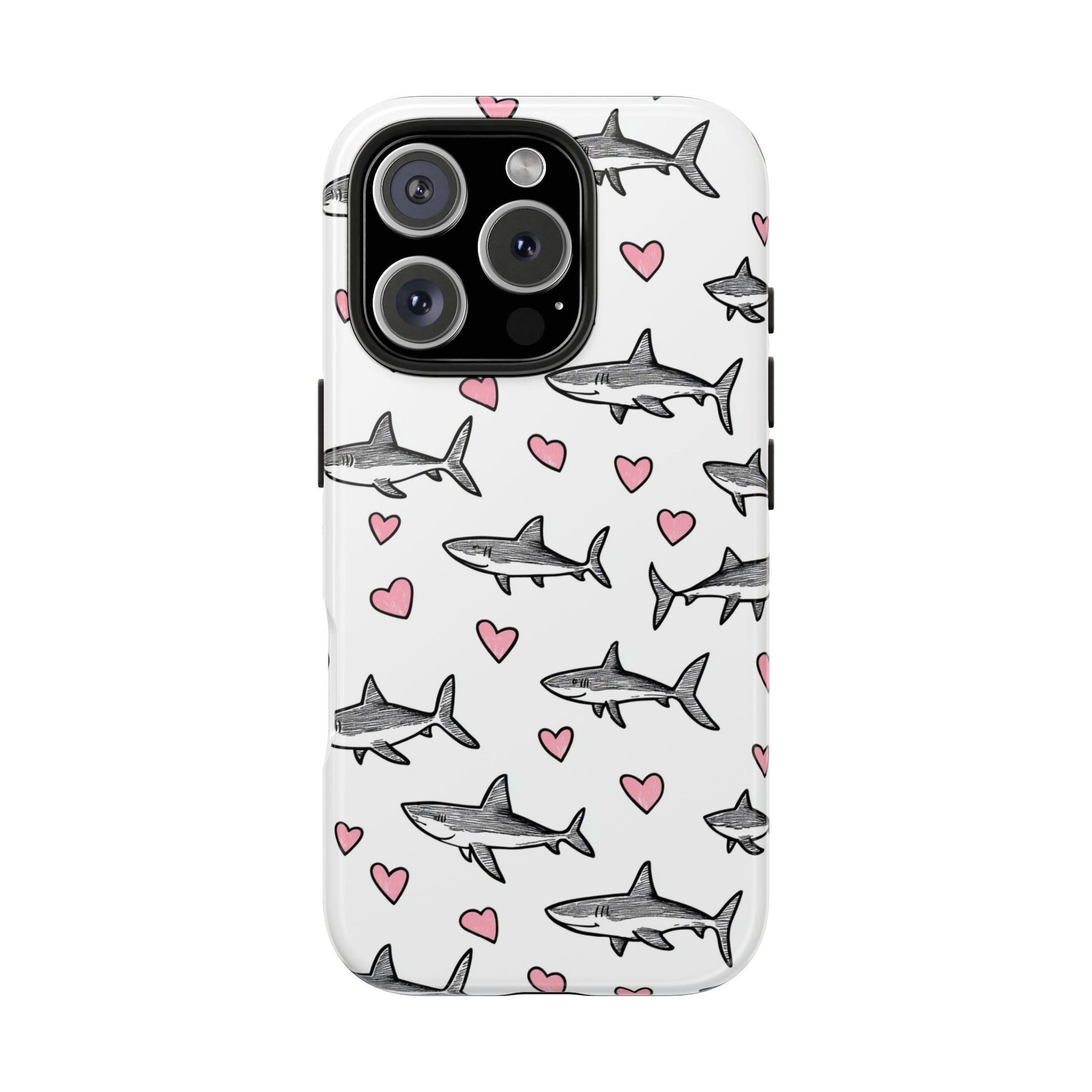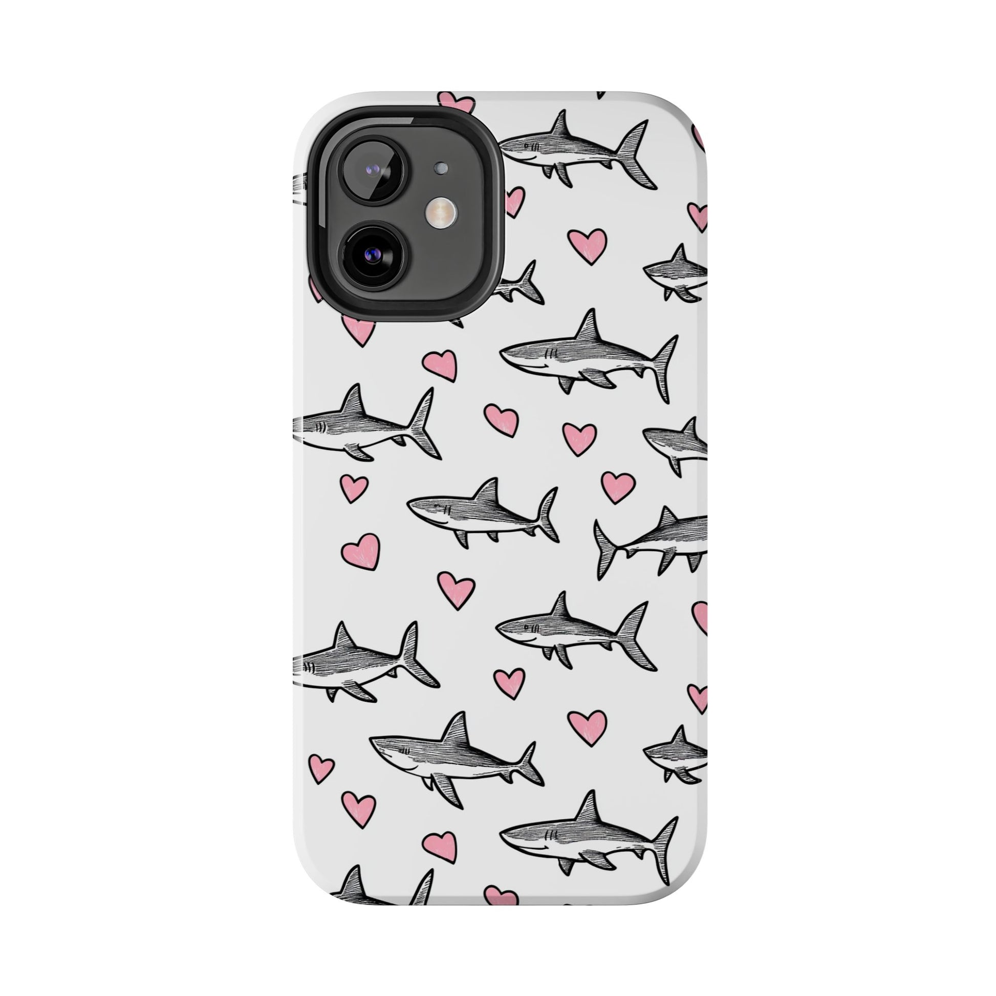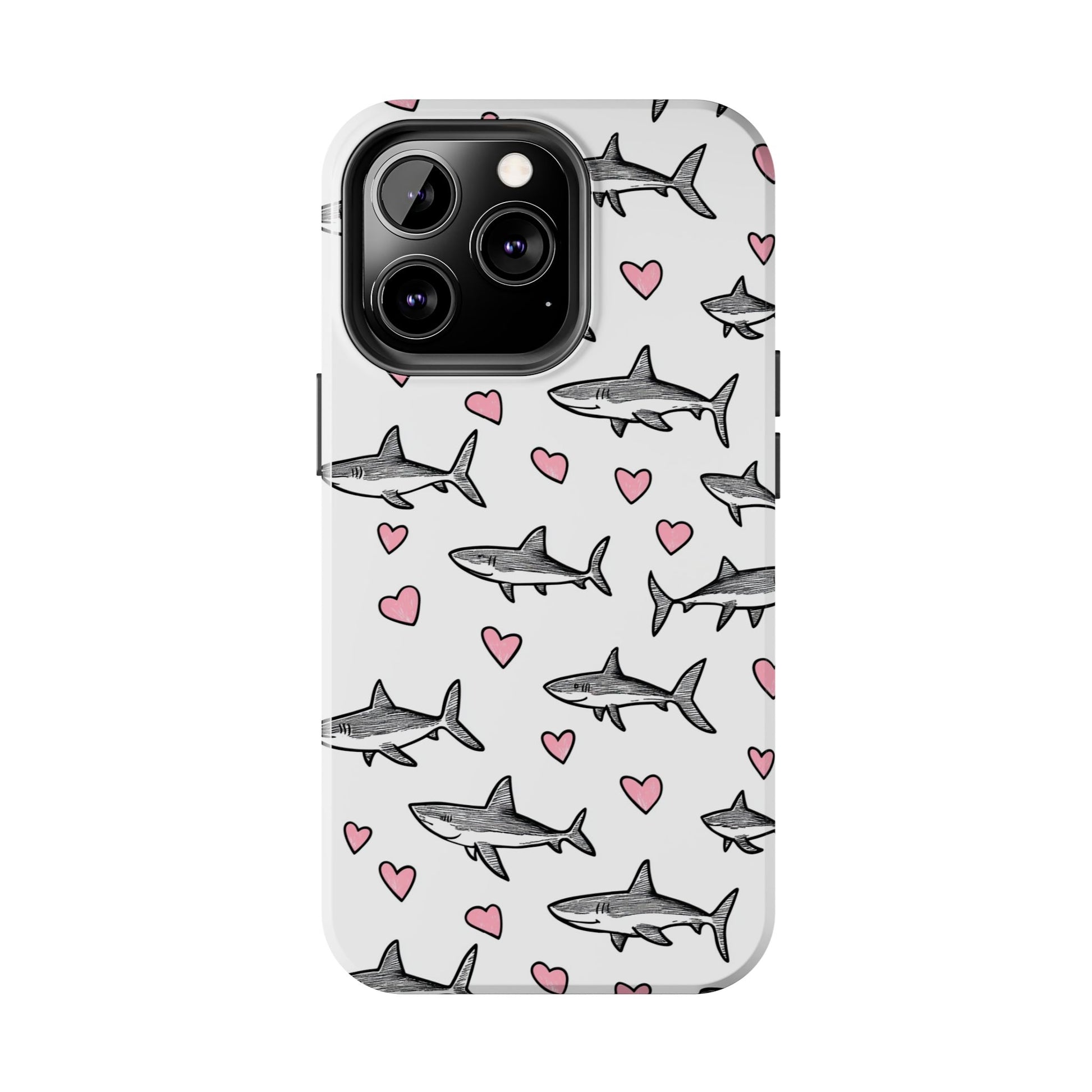 Stylish and durable phone cases featuring a design of sharks and hearts. These tough phone cases are perfect for those who want to protect their phone in style. Great for anyone who loves marine life or has a bold personality. Ideal for gifts on Valentine's Day or birthdays.
