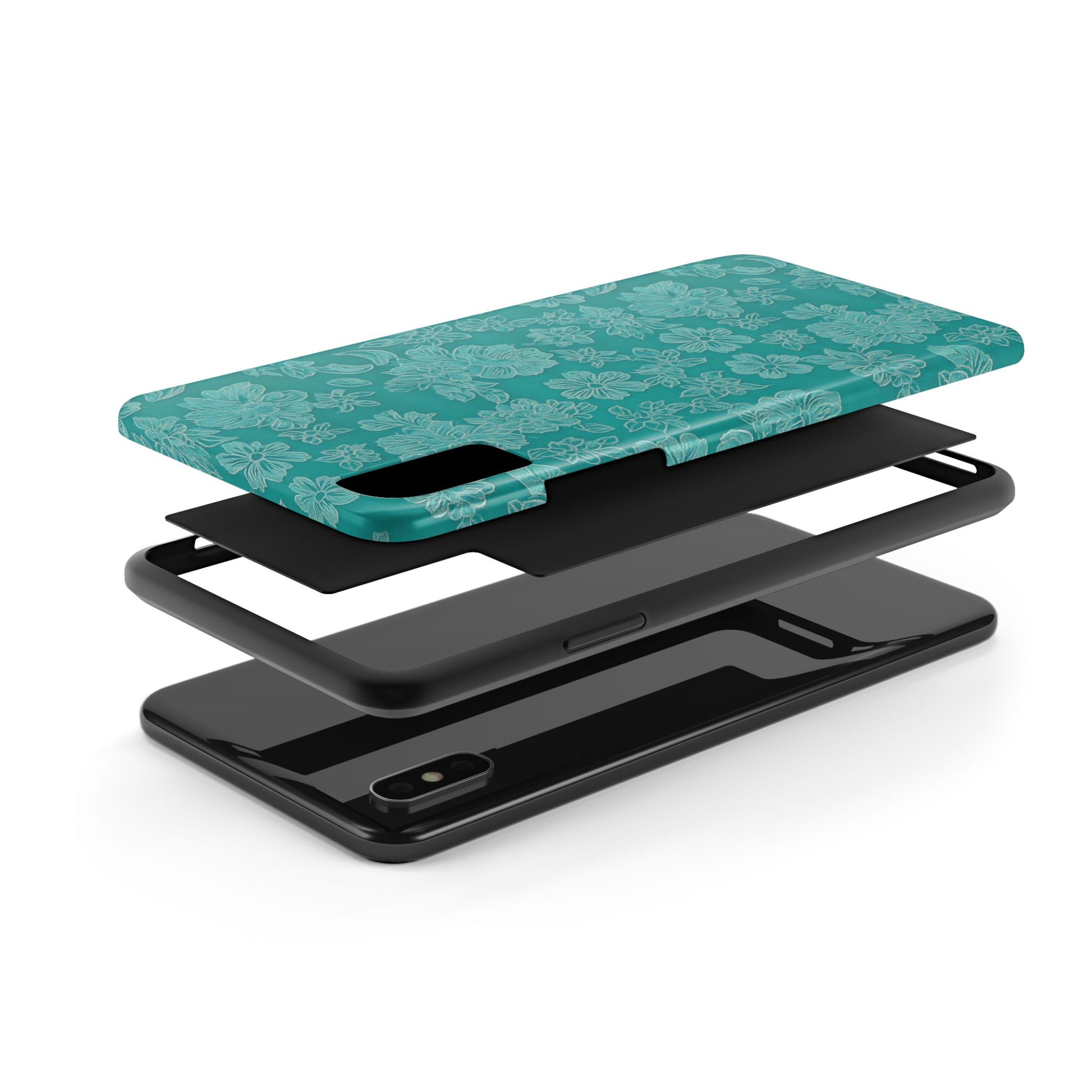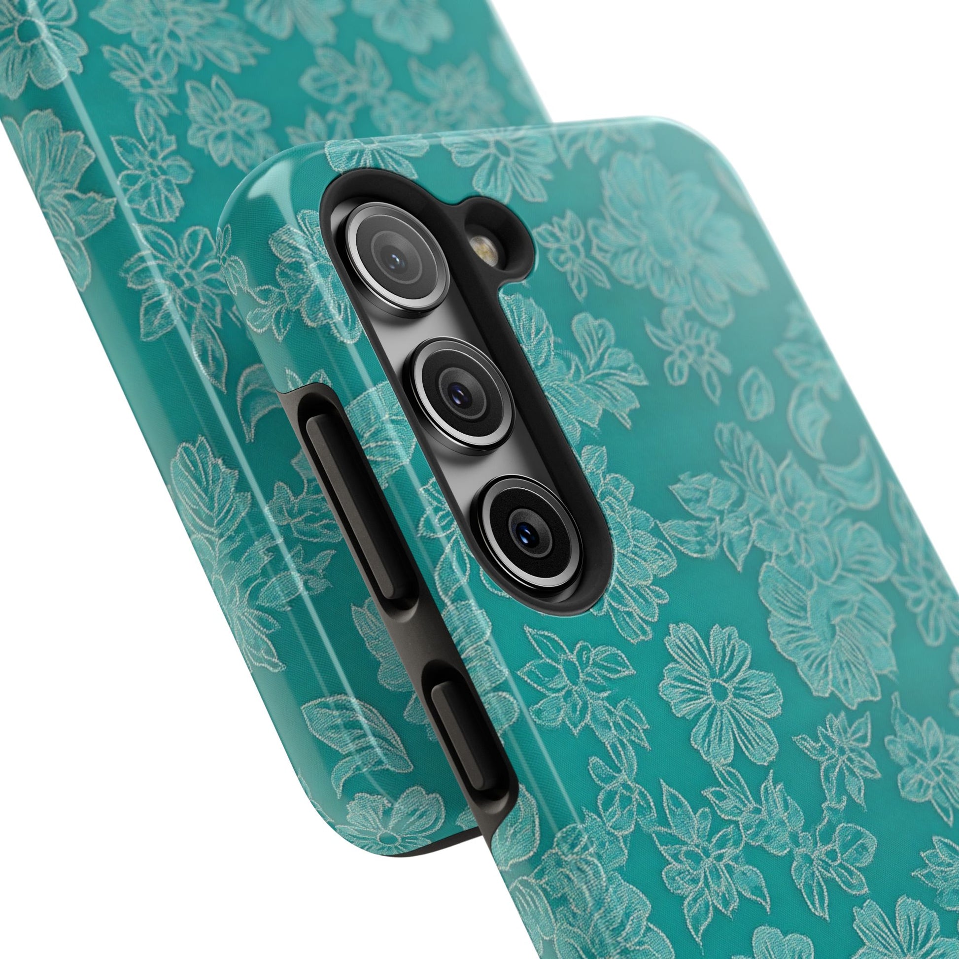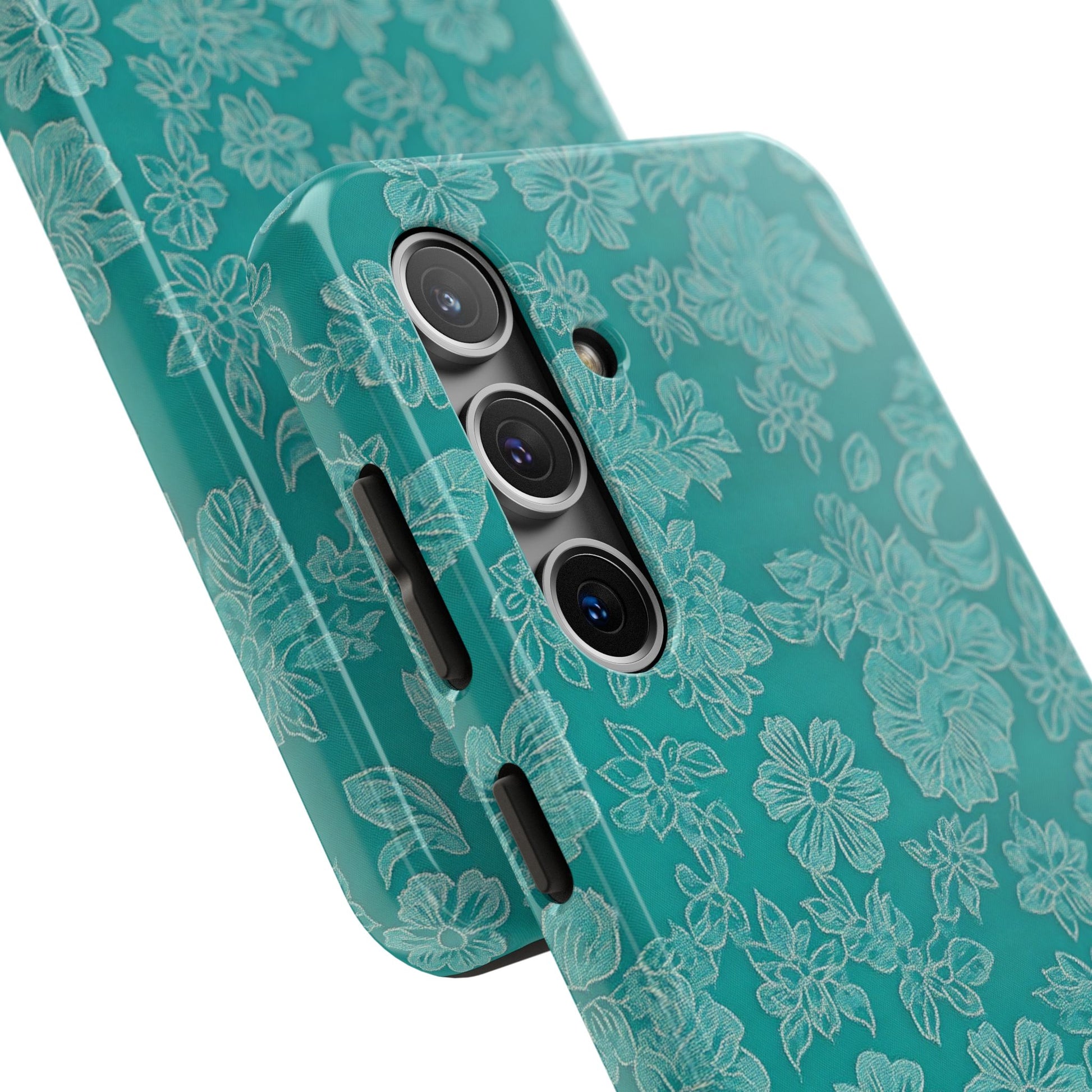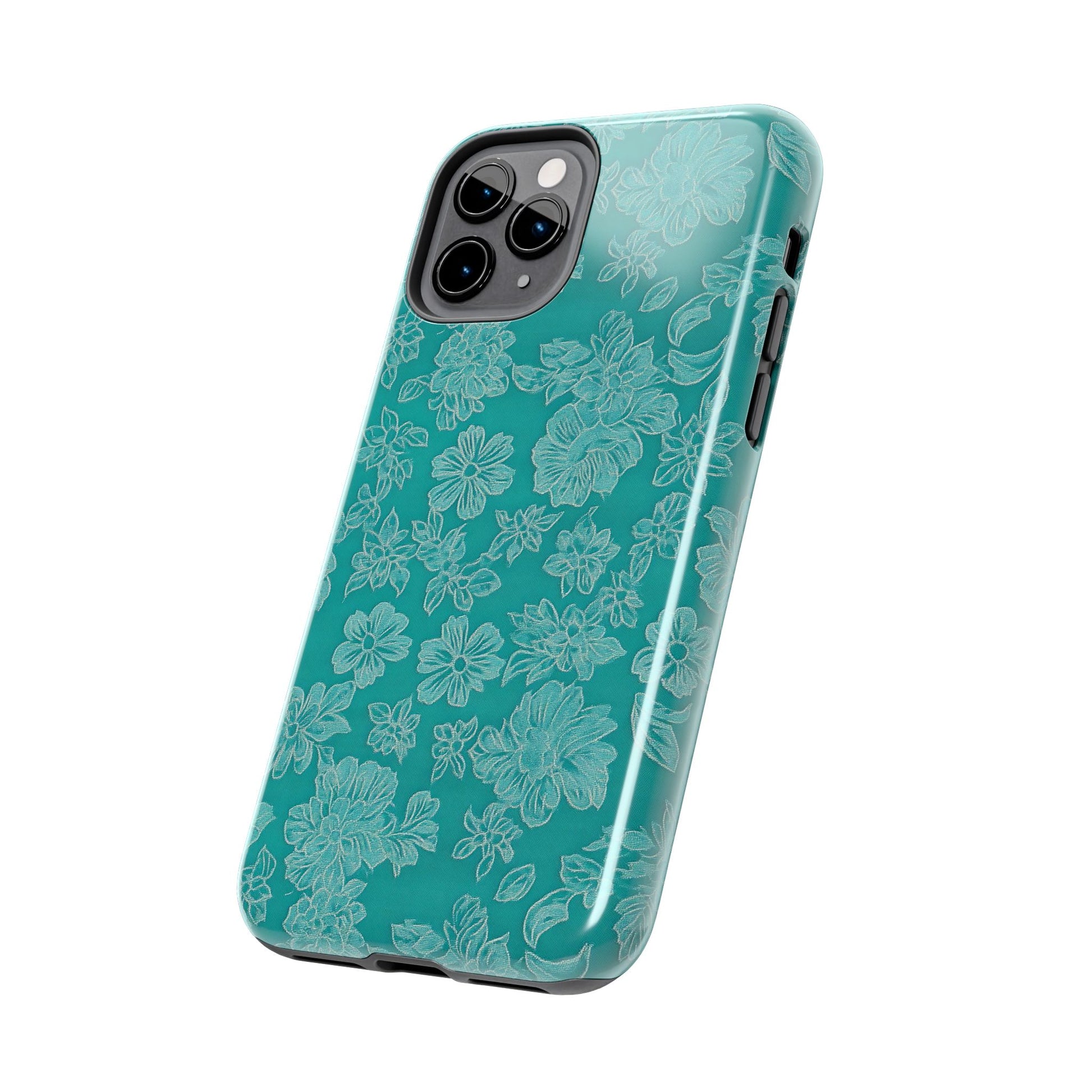 A stylish and protective phone case featuring teal lace on a teal background. This tough phone case is perfect for those looking for durable protection with a touch of elegance. Ideal for individuals who prioritize both style and functionality in their phone accessories. Great for gifting on birthdays, holidays, or any special occasion.